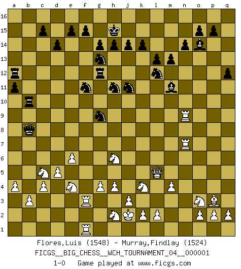 Last move : 1-0 2011 January 16 23:12:53 [Event "FICGS__BIG_CHESS__WCH_TOURNAMENT_04__000001"] [Site "FICGS"] [Date "2010.09.28"] [Round "1"] [White "Flores,Luis"] [Black "Murray,Findlay"] [Result "1-0"] [WhiteElo "1548"] [BlackElo "1524"] 1.g2-g4 j15-k13 2.p1-o3 h15-g13 3.b1-c3 n15-n14 4.k1-l3 o16-n15 5.j2-k4 n15-o14 6.h1-c6 b16-c14 7.g1-f3 k16-h15 8.d2-d4 a15-a13 9.c1-k8 d15-d14 10.n2-n4 a13-a12 11.k8-h6 a12-a11 12.c6-c10 p16-n15 13.e2-e4 m15-m13 14.m2-m4 n15-l14 15.f1-b5 c16-h11 16.b5-h11 g13-h11 17.c10-b11 h15-g13 18.b11-b15 c14-e13 19.b15-b9 g15-g14 20.b9-a8 h16-o10 21.h3-h4 f16-g15 22.h6-j5 o10-p10 23.l1-o4 g16-j15 24.o4-p3 j16-h15 25.o1-k5 p10-b10 26.c3-a4 l16-m15 27.b2-b3 e16-b16 28.c2-c4 l14-j13 29.a1-d1 j15-h13 30.a4-c5 k13-j11 31.f3-g5 e13-f11 32.l3-j4 a16-a12 33.e4-e5 q15-q13 34.f2-f4 q13-q12 35.e5-e6 g15-e13 36.a8-l8 j13-l12 37.l8-k7 h13-k12 38.j5-n9 b10-a9 39.n9-l7 e13-l7 40.k7-l7 a9-f4 41.e1-f1 f4-a9 42.a2-a4 b16-b12 43.l7-g11 k15-k14 44.j1-j2 m16-b16 45.k5-f9 b12-g12 46.g11-l7 b16-b12 47.f9-e8 q16-b16 48.e8-a12 b12-a12 49.f1-f3 h11-g9 50.d1-f1 m15-g10 51.d4-d5 g10-n4 52.q1-n1 n4-j8 53.g5-e4 l15-l13 54.j4-h6 j8-m11 55.n1-n9 a9-b8 56.l7-l5 k12-h11 57.m1-n1 b16-b10 58.n1-n7 1-0 This big chess game has been lost on time (started : 2010.09.28 11:49:24) Follow this game move after move (download)We must make sure that Chess will not be like a dead language, very interesting, but for a very small group. (Sytze Faber) Wenn ich einen Club besuche, sind die Spieler stumm vor Staunen. (José Raúl Capablanca) Cuando le juegas a Fischer, no es una cuestion de si vas a ganar o perder. Es una cuestion de si vas a sobrevivir. (Boris Spassky) Aux échecs, les retours au sommet sont rares : les dommages psychologiques consécutifs à une défaite sont trop sévères. (Daily Telegraph) Work expands to fill the time available. (C. Northcote Parkinson, in Parkinson's Laws)