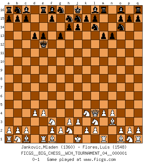Last move : 0-1 2010 November 24 10:42:1 [Event "FICGS__BIG_CHESS__WCH_TOURNAMENT_04__000001"] [Site "FICGS"] [Date "2010.09.28"] [Round "1"] [White "Jankovic,Mladen"] [Black "Flores,Luis"] [Result "0-1"] [WhiteElo "1360"] [BlackElo "1548"] 1.j2-k4 p16-o14 2.d2-d4 k16-l14 3.e2-e4 g15-g13 4.g1-f3 h16-d12 5.m2-m4 d15-d13 6.n2-n4 n15-n13 7.h1-l4 e15-e13 8.l1-n3 d12-e12 9.k1-l3 m15-m13 0-1 This big chess game has been lost on time (started : 2010.09.28 11:49:24) Follow this game move after move (download)Place the contents of the Chess box in a hat, shake them up vigorously, pour them on the board from a height of two feet, and you get the style of Steinitz. (H. E. Bird) Kein Schachspieler kann gut schlafen. (H. G. Wells) Un Peón pasado aumenta su poder a medida de que el número de piezas en el tablero disminuye. (Capablanca) Karpov est une pièce de musée. (Garry Kasparov) You can only get smarter by playing a smarter opponent. (Revolver, movie)