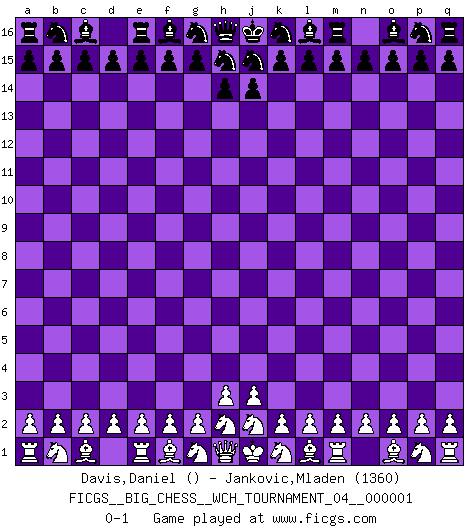Last move : 0-1 2010 September 12 20:42:10 [Event "FICGS__BIG_CHESS__WCH_TOURNAMENT_04__000001"] [Site "FICGS"] [Date "2010.08.13"] [Round "1"] [White "Davis,Daniel"] [Black "Jankovic,Mladen"] [Result "0-1"] [WhiteElo ""] [BlackElo "1360"] 0-1 This big chess game has been lost on time (started : 2010.08.13 15:52:6) Follow this game move after move (download)I feel as if I were a piece in a game of Chess, when my opponent says of it: That piece cannot be moved. (Soren Kierkegaard) Ich tröste mich mit dem Vergnügen, daß Schachfans, Zuschauer und Leser glücklich sind, wenn ein Großmeister etwas riskiert, statt nur Klötzchen zu schieben. (Mikhail Nekhemyevich Tal) Solo puedes ser bueno en el Ajedrez si amas al juego. (Bobby Fischer) Le pion, dans sa simplicité, marche droit devant lui, mais lorsqu'il prend, il le fait obliquement? Ainsi l'homme, tant qu'il reste pauvre, marche dans la droiture et vit honnêtement, mais lorsqu'il recherche les honneurs, il flatte, se parjure et, par les voies obliques, cherche une position supérieure sur l'échiquier du monde. (Jean de Galles) God, you are such an idiot. - Actually, I thought I was more of a jerk. (Gregory House to Stacy Warner, House M.D.)