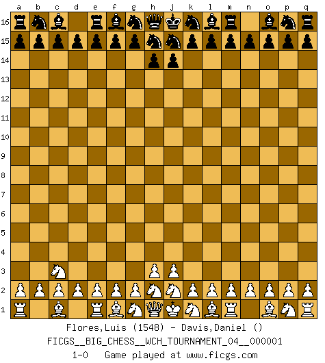Last move : 1-0 2010 October 30 22:40:26 [Event "FICGS__BIG_CHESS__WCH_TOURNAMENT_04__000001"] [Site "FICGS"] [Date "2010.09.28"] [Round "1"] [White "Flores,Luis"] [Black "Davis,Daniel"] [Result "1-0"] [WhiteElo "1548"] [BlackElo ""] 1.b1-c3 1-0 This big chess game has been lost on time (started : 2010.09.28 11:49:24) Follow this game move after move (download)Via the squares on the chessboard, the Indians explain the movement of time and the age, the higher influences which control the world and the ties which link Chess with the human soul. (Al-Masudi) Ich hatte Zahnschmerzen im ersten Spiel. In der zweiten Partie tat mir der Kopf weh. In der dritten war es eine Rheuma-Attacke und während der vierten fühlte ich mich nicht gut. Und in der fünften? Nun, man muss doch nicht jedes Spiel gewinnen, oder? (Savielly Grigorievitsch Tartakower) El Ajedrez es un expediente tonto que hace creer a la gente inactiva que hacen una cosa muy astuta cuando solamente estan perdiendo su tiempo. (George Bernard Shaw) Donnez-moi un Cavalier en 6e et je gagnerais toutes mes parties. (Steinitz) Big Chess is a place for big hallucinations. (Thibault de Vassal)