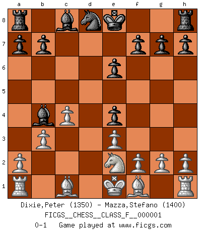 Last move : 0-1 2006 May 29 12:12:0 [Event "FICGS__CHESS__CLASS_F__000001"] [Site "FICGS"] [Date "2006.04.28"] [Round "1"] [White "Dixie,Peter"] [Black "Mazza,Stefano"] [Result "0-1"] [WhiteElo "1350"] [BlackElo "1400"] 1.d4 d5 2.c4 e6 3.Nc3 Nf6 4.e3 c5 5.b3 cxd4 6.Qxd4 Nc6 7.Qd1 Ne4 8.Nxe4 dxe4 9.Qxd8+ Nxd8 10.Ne2 Bb4+ 0-1 QGD : 3...Nf6 Player Black won this chess game. Follow this game move after move (download)Chess is the art which expresses the science of logic. (Mikhail Botvinnik) Im Leben werden Partien nie so unstrittig gewonnen wie im Spiel (Emanuel Lasker) No existe un remordimiento como el remordimiento del Ajedrez. (H. G. Wells) La menace est plus forte que l'exécution. (Aaron Nimzovitch) Unless in communicating with it one says exactly what one means, trouble is bound to result. (Alan Turing, about computers)