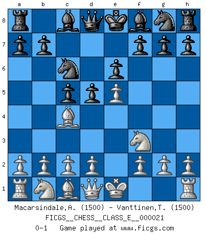Last move : 0-1 2007 January 18 12:37:27 [Event "FICGS__CHESS__CLASS_E__000021"] [Site "FICGS"] [Date "2006.11.14"] [Round "1"] [White "Macarsindale,Arthur Alfred"] [Black "Vanttinen,Timo"] [Result "0-1"] [WhiteElo "1500"] [BlackElo "1500"] 1.e4 c5 2.Bc4 e6 3.e5 Nc6 4.Nf3 d5 0-1 Sicilian defense Player Black won this chess game. Follow this game move after move (download)Adequate compensation for a sacrifice is having a sound combination leading to a winning position; adequate compensation for a blunder is having your opponent snatch defeat from the jaws of victory. (Bruce A. Moon) Der Umstand, daß uns eine 7 Stunden Zeitkontrolle ermöglicht eine großartige, tiefe Partie zu spielen, ist für die Massenmedien nicht weiter von Bedeutung. (Alexej Shirov) Prefiero perder una partida realmente buena, que ganar una mala. (David Levy) Vous n'êtes pas toujours obligé de jouer le meilleur coup. Un coup doit être actif, entreprenant, correct et beau ! (David Bronstein) I live to kill Traxler counterattack. (Ilmars Cirulis)
