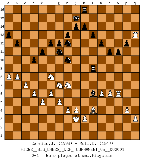 Last move : 0-1 2011 May 4 17:33:11 [Event "FICGS__BIG_CHESS__WCH_TOURNAMENT_05__000001"] [Site "FICGS"] [Date "2010.07.11"] [Round "1"] [White "Carrizo,Jose"] [Black "Meli,Cosimo Leonardo"] [Result "0-1"] [WhiteElo "1999"] [BlackElo "1547"] 1.j2-k4 h15-g13 2.h1-o7 m15-m13 3.o7-c7 j15-k13 4.c7-c15 h16-o10 5.h2-g4 o10-o2 6.m2-m4 o2-o10 7.p1-o3 b16-c14 8.c15-j9 e15-e13 9.n2-n4 l16-o13 10.c2-c3 d15-d13 11.d2-d4 o15-o14 12.o1-m3 n15-n13 13.q1-o1 c16-k9 14.b1-d2 f16-b12 15.g1-j2 k16-h15 16.k1-h2 g16-f14 17.d2-f3 o16-f8 18.g2-g3 p16-n15 19.f3-h4 n15-l14 20.h2-f3 a16-c16 21.f3-e5 m13-m12 22.j1-h2 l14-j15 23.l2-l3 k13-l11 24.c1-d2 j15-k13 25.b2-b4 j16-j15 26.a2-a4 c14-d12 27.a4-a5 a15-a13 28.f1-g2 f14-e12 29.h4-j6 d12-f11 30.j6-h8 k9-h7 31.l3-l4 f8-g9 32.h8-f7 g9-d12 33.k2-k3 h15-f14 34.h3-h4 o10-h10 35.j9-h10 f11-h10 36.l1-o4 h10-f9 37.g4-j5 h7-k9 38.l4-l5 e12-g11 39.f2-f3 f14-e12 40.e2-e4 k9-j10 41.f3-f4 o13-n14 42.f7-g5 f15-f13 43.g3-g4 h14-h13 44.f4-f5 g13-j12 45.e5-g6 g15-g13 46.e4-e5 f13-f12 47.g5-e6 e12-d10 48.o3-n5 e13-e12 49.q2-q3 l15-l13 50.p2-p4 o14-o13 51.o4-p5 o13-o12 52.a1-c1 p15-p13 53.c3-c4 p13-p12 54.c4-c5 k15-k14 55.b4-b5 q15-q13 56.b5-b6 o12-o11 57.a5-a6 n13-n12 58.a6-a7 n12-n11 59.d4-d5 b12-e15 60.c5-c6 b15-b13 61.b6-b7 b13-b12 62.d5-d6 d12-b14 63.c6-c7 d13-d12 64.a7-a8 d12-d11 65.k4-h5 j10-g8 66.g2-k5 g8-k5 67.m3-k5 n14-h9 68.m1-n1 h9-f11 69.c1-b1 g13-g12 70.p5-e15 e16-e15 71.f5-f6 e12-e11 72.e6-g7 f9-g7 73.h5-g7 f11-e10 74.j5-h7 e15-d15 75.n5-l6 l11-k9 76.l6-j5 j12-h10 77.o1-o8 d10-f11 78.j2-l3 d11-d10 79.j3-j4 k9-l7 80.k5-l4 c16-c9 81.o8-q8 c9-m9 82.m4-m5 b14-d16 83.n1-o1 d15-c15 84.m5-m6 l7-k9 85.n4-n5 d16-l9 86.e1-e2 l9-d2 87.e2-d2 k9-m10 88.l3-m5 m9-n9 89.o1-o5 f11-g9 90.h2-j3 g9-h7 91.j5-h7 c15-c9 92.m5-n7 m10-o9 93.n7-o9 n9-o9 94.d2-o2 o9-o5 95.o2-o5 c9-l9 96.n5-n6 m16-c16 97.o5-q5 q16-q15 98.g6-f8 e10-f11 99.q8-q13 q15-q13 100.q5-q13 l9-l5 101.g4-g5 k13-h12 102.b7-b8 c16-k16 103.b1-o1 l5-l9 104.o1-o6 f11-l6 0-1 This big chess game has been lost on time (started : 2010.07.11 1:17:3) Follow this game move after move (download)The battle for the ultimate truth will never be won. And that's why Chess is so fascinating. (Hans Kmoch) Ich spiele 70 Eröffnungssysteme. (Viktor Kortschnoi) Una partida de Ajedrez se divide en 3 etapas: la primera cuando piensas que tienes la ventaja, la segunda cuando crees que tienes la ventaja y la tercera... ¡cuando te das cuenta que vas a perder!. (Savielly Tartakower) Botvinnik disait en comparant les échecs à la musique: Il existe une science dont le but est l'étude de l'acoustique et des sons. Mais il y a aussi un art qui se sert de l'océan des sons : c'est la musique. De toute évidence, il en est de même pour la pensée. La logique est l'étude des lois de la réflexion et les échecs reflètent, en tant qu'art, le côté logique de la réflexion, sous la forme d'images artistiques... Extrait de Fischer - Spassky, Reykjavik 1972 par Alexander & F. Wyndham (Ed. Solar), p 37. Experience is the name we all give to our mistakes. (Oscar Wilde)