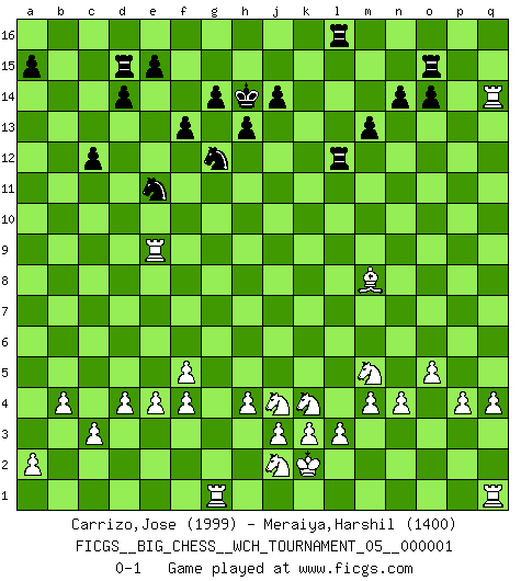 Last move : 0-1 2011 February 25 11:7:28 [Event "FICGS__BIG_CHESS__WCH_TOURNAMENT_05__000001"] [Site "FICGS"] [Date "2010.09.28"] [Round "1"] [White "Carrizo,Jose"] [Black "Meraiya,Harshil"] [Result "0-1"] [WhiteElo "1999"] [BlackElo "1400"] 1.j2-k4 g15-g14 2.h1-o7 p16-o14 3.o7-c7 d15-d14 4.c7-l15 k16-l14 5.l15-c7 g16-f14 6.o2-o3 h14-h13 7.n2-n4 m15-m13 8.m2-m4 j15-k13 9.c2-c3 o14-n12 10.d2-d4 f16-j13 11.c7-c6 l16-p12 12.e2-e4 m16-l16 13.l2-l3 n15-n14 14.l1-p5 o16-k12 15.q2-q4 p12-l8 16.p1-q3 l8-h11 17.o1-f9 h11-f9 18.c6-f9 l14-m12 19.b1-d2 b16-c14 20.d2-b3 c14-e13 21.b3-c5 k12-n9 22.h2-g4 c16-e14 23.k1-h2 f14-g12 24.g1-j2 f15-f13 25.g2-g3 e14-c12 26.f9-c6 c15-c13 27.q3-o4 c12-b11 28.k2-k3 n12-m10 29.j1-k2 m10-l8 30.h3-h4 c13-c12 31.g4-j5 l8-j7 32.c1-j7 h16-l13 33.j7-k6 b11-a10 34.k6-n9 j13-n9 35.m1-l1 l13-f8 36.f2-f4 a16-c16 37.f4-f5 l16-l14 38.c5-e6 f8-k8 39.e6-f4 a10-b11 40.f1-j4 k8-b8 41.b2-b4 n9-m10 42.c6-o6 o15-o14 43.o6-m8 b8-m8 44.p5-m8 q16-l16 45.o4-m5 h15-j13 46.p2-p4 e13-f11 47.f4-e6 m10-d2 48.e1-d1 d2-e3 49.e6-f4 f11-e9 50.d1-d3 b11-j4 51.h2-j4 m12-n10 52.m8-n7 e3-f4 53.g3-f4 j13-k11 54.d3-g3 j16-h15 55.a1-g1 k13-m12 56.o3-o4 l14-l12 57.g3-g9 e9-f7 58.g9-d9 l16-l14 59.n7-l5 e16-l16 60.g1-g7 b15-b14 61.g7-f7 n10-m8 62.o4-o5 c16-d16 63.d9-a9 d16-d15 64.f7-a7 l16-a16 65.l5-b14 k11-l9 66.b14-k6 m12-k11 67.k6-m8 g12-e11 68.j5-k7 l9-k7 69.a7-k7 k11-j13 70.a9-e9 j13-g12 71.k7-k15 h15-h14 72.k15-p15 q15-q14 73.l1-g1 l14-l15 74.p15-p14 l15-o15 75.p14-q14 a16-l16 0-1 This big chess game has been lost on time (started : 2010.09.28 11:50:18) Follow this game move after move (download)Pawns are born free, yet they are everywhere in chains. (Rick Kennedy) Jeder leidlich begabte Spieler, er braucht keineswegs hervorragend veranlagt zu sein, kann es zum Meister bringen. Aber das ist ja auch gar nicht nötig! Der richtige Standpunkt ist es, zu seinem Vergnügen zu spielen, und man glaube ja nicht, dass der Genuss proportional dem Können sei. (Siegbert Tarrasch) El Ajedrez era la lengua materna de Capablanca. (Reti) A chaque perte on perd un peu de soi. (Joël Lautier) Hello Thibault, if I have had a plan (and I had one, I hope), I have forgotten it during the last week... - Hello Heinz-Georg. What do you mean a plan ? (Anonymous players, during a Big Chess game)