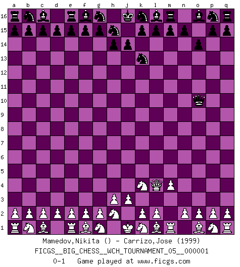 Last move : 0-1 2010 July 13 20:28:41 [Event "FICGS__BIG_CHESS__WCH_TOURNAMENT_05__000001"] [Site "FICGS"] [Date "2010.07.11"] [Round "1"] [White "Mamedov,Nikita"] [Black "Carrizo,Jose"] [Result "0-1"] [WhiteElo ""] [BlackElo "1999"] 1.m2-m4 j15-k13 2.j2-k4 o15-o14 3.h1-l4 h16-o10 0-1 Follow this game move after move (download)All I want to do, ever, is just play Chess. (Bobby Fischer) Fischer ist das größte Genie, das je vom Schachhimmel heruntergestiegen ist. (Mikhail Nekhemyevich Tal) Cuando tengas duda... ¡juega al Ajedrez!. (Tevis) Je crois qu'il existe des manières très spécifiques de jouer efficacement contre une machine. Evidemment, nous n'avons aucune chance en technique pure, parce que l'ordinateur calcule de manière parfaite. Mais lorsque nous faisons appel à notre cerveau, en utilisant l'intuition et la compréhension, alors nous restons beaucoup plus forts. (Anatoli Karpov) To steal ideas from one person is plagiarism. To steal from many is research. (Unknown)