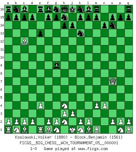 Last move : 1-0 2010 August 28 22:52:27 [Event "FICGS__BIG_CHESS__WCH_TOURNAMENT_05__000001"] [Site "FICGS"] [Date "2010.07.11"] [Round "1"] [White "Koslowski,Volker"] [Black "Block,Benjamin"] [Result "1-0"] [WhiteElo "1880"] [BlackElo "1561"] 1.j2-h4 j15-k13 2.m2-m4 n15-n14 3.e2-e4 e15-e13 4.n2-n4 o16-g9 5.h1-o7 p16-o14 6.o1-c12 1-0 This big chess game has been lost on time (started : 2010.07.11 1:17:3) Follow this game move after move (download)Daring ideas are like Chess men moved forward. They may be beaten, but they may start a winning game. (Johann Wolfgang von Goethe) Jede Eröffnung ist gut genug um gespielt zu werden, wenn nur ihr Ruf schlecht genug ist. (Savielly Grigorievitsch Tartakower) Yo he agregado estos principios a la ley: pongan los Caballos en acción antes de que los dos Alfiles sean desarrollados. (Emanuel Lasker) Soyez une menace à chaque fois que vous vous asseyez pour jouer. (Ken Smith) Chess is as much a mystery as women. (Purdy)