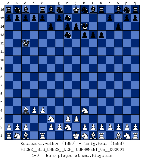 Last move : 1-0 2010 October 14 9:48:17 [Event "FICGS__BIG_CHESS__WCH_TOURNAMENT_05__000001"] [Site "FICGS"] [Date "2010.08.13"] [Round "1"] [White "Koslowski,Volker"] [Black "Konig,Paul"] [Result "1-0"] [WhiteElo "1880"] [BlackElo "1588"] 1.j2-k4 o15-o14 2.e2-e4 j15-h13 3.h1-l4 l15-l13 4.d2-d4 k15-k13 5.f1-c4 h16-k14 6.g1-f3 m15-m13 7.l4-f9 f15-f14 8.f9-c12 1-0 This big chess game has been lost on time (started : 2010.08.13 15:53:24) Follow this game move after move (download)Chess is like war on a board. (Bobby Fischer) Zeige mir drei Eröffnungsvarianten und ich beweise dir, dass zwei davon inkorrekt sind. (Emanuel Lasker) El Ajedrez es realmente noventa y nueve por ciento calculación. (Soltis) Horreur, mais aussi harmonie suprême : qu'y avait-il en effet au monde en dehors des échecs ? Le brouillard, l'inconnu, le non-être... (Vladimir Nabokov) True nature is revealed in times of difficulty. (Chinese proverb)