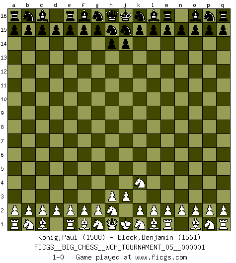Last move : 1-0 2010 September 13 8:48:35 [Event "FICGS__BIG_CHESS__WCH_TOURNAMENT_05__000001"] [Site "FICGS"] [Date "2010.08.13"] [Round "1"] [White "Konig,Paul"] [Black "Block,Benjamin"] [Result "1-0"] [WhiteElo "1588"] [BlackElo "1561"] 1.j2-k4 1-0 This big chess game has been lost on time (started : 2010.08.13 15:53:24) Follow this game move after move (download)What is the object of playing a gambit opening?... To acquire a reputation of being a dashing player at the cost of losing a game. (Siegbert Tarrasch) Irgendwie scheint mir sonntags früh um 9 Uhr der Killerinstinkt verloren gegangen zu sein. (Alexej Shirov) Cada Peón es una Reina en potencia. (James Mason) Tout change constamment, y compris dans le monde des Echecs. (Botvinnik) Better than a thousand days of diligent study is one day with a great teacher. (Japanese proverb)