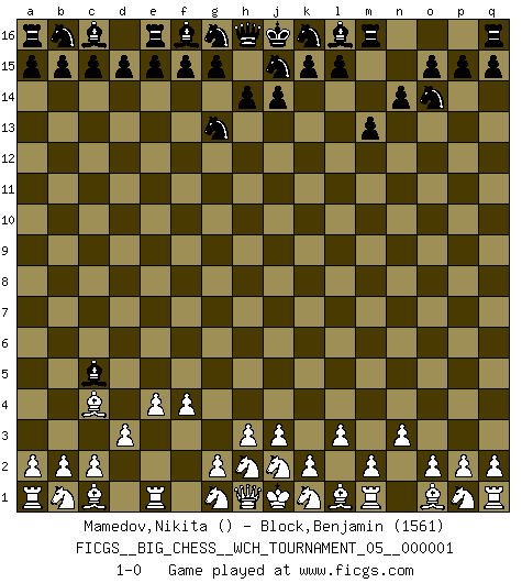 Last move : 1-0 2010 August 30 22:55:51 [Event "FICGS__BIG_CHESS__WCH_TOURNAMENT_05__000001"] [Site "FICGS"] [Date "2010.07.11"] [Round "1"] [White "Mamedov,Nikita"] [Black "Block,Benjamin"] [Result "1-0"] [WhiteElo ""] [BlackElo "1561"] 1.e2-e4 h15-g13 2.f1-c4 n15-n14 3.l2-l3 m15-m13 4.n2-n3 p16-o14 5.d2-d3 o16-c5 6.f2-f4 1-0 This big chess game has been lost on time (started : 2010.07.11 1:17:3) Follow this game move after move (download)The most powerful weapon in Chess is to have the next move. (David Bronstein) Es tut gut, die Entwicklungsperiode von, [...] demokratischem Geist durchdringen zu lassen. Wie undemokratisch wäre es doch beispielsweise, den einen Offizier große Spaziertouren vornehmen zu lassen, während die anderen zu Hause säßen und sich entsetzlich langweilten. (Aaron Nimzowitsch) Las combinaciones han sido siempre el aspecto más intrigante del Ajedrez. Los Maestros las buscan, el público las aplauden, los críticos las alaban. La razón se debe a que las combinaciones hacen posible que el Ajedrez sea más que un ejercicio matemático con una carencia de vida. Ellas son la poesía del juego, son del Ajedrez lo que la melodía es de la música. Ellas representan el triunfo de la mente sobre la materia. (Reuben Fine) Il s'avisa de me proposer d'apprendre les échecs qu'il jouait un peu... me voilà forcené des échecs. J'achète un échiquier, je m'enferme dans ma chambre, j'y passe des jours et des nuits à vouloir apprendre par cur toutes les parties. (Jean-Jacques Rousseau, Confessions) The only difference between a tax man and a taxidermist is that the taxidermist leaves the skin. (Mark Twain)
