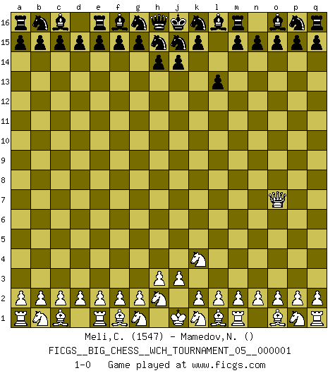 Last move : 1-0 2010 July 12 13:41:19 [Event "FICGS__BIG_CHESS__WCH_TOURNAMENT_05__000001"] [Site "FICGS"] [Date "2010.07.11"] [Round "1"] [White "Meli,Cosimo Leonardo"] [Black "Mamedov,Nikita"] [Result "1-0"] [WhiteElo "1547"] [BlackElo ""] 1.j2-k4 l15-l13 2.h1-o7 1-0 Follow this game move after move (download)A Chess game is divided into three stages: the first, when you hope you have the advantage, the second when you believe you have an advantage, and the third... when you know you're going to lose ! (Savielly Tartakower) Ich kenne Menschen, die allen Willen der Welt besitzen und doch nicht Schach spielen können. (Robert James Fischer) El Ajedrez demanda una total concentración. (Bobby Fischer) Les échecs, c'est la lutte contre l'erreur. (Johannes Zukertort) At work, the authority of a person is inversely proportional to the number of pens that person is carrying. (Dan Rotaru)