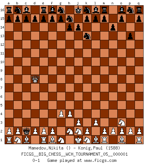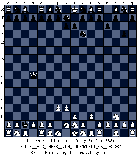 Last move : 0-1 2010 August 26 16:27:52 [Event "FICGS__BIG_CHESS__WCH_TOURNAMENT_05__000001"] [Site "FICGS"] [Date "2010.08.13"] [Round "1"] [White "Mamedov,Nikita"] [Black "Konig,Paul"] [Result "0-1"] [WhiteElo ""] [BlackElo "1588"] 1.g2-g4 j15-k13 2.p1-o3 h16-o10 3.h3-h4 o10-l10 4.l2-l3 p15-p13 5.h1-d5 n15-n14 6.d5-d8 l10-c2 0-1 Follow this game move after move (download)I don't believe in psychology. I believe in good moves. (Bobby Fischer) Schachspieler können ausgezeichnet Varianten am Schachbrett berechnen, aber nicht im realen Leben. Zu stark ist der Individualismus im Schach ausgeprägt, und für viele ist ein kleiner momentaner persönlicher Vorteil wichtiger als ein weit größerer Vorteil von morgen. (Anatoly Karpov) El Ajedrez era la lengua materna de Capablanca. (Reti) Ce qui caractérise les parties de combat, c'est que si le défenseur a constamment de difficiles problèmes à résoudre, l'attaquant doit chercher sans relâche de nouvelles possibilités d'attaque. (Koblentz) There is a very easy way to return from a casino with a small fortune : go there with a large one. (Jack Yelton)