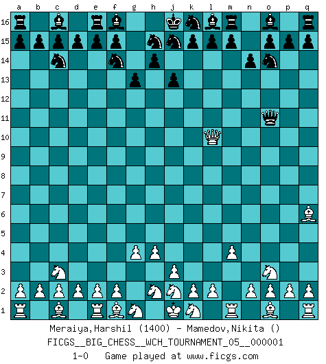 Last move : 1-0 2010 October 23 4:40:40 [Event "FICGS__BIG_CHESS__WCH_TOURNAMENT_05__000001"] [Site "FICGS"] [Date "2010.09.28"] [Round "1"] [White "Meraiya,Harshil"] [Black "Mamedov,Nikita"] [Result "1-0"] [WhiteElo "1400"] [BlackElo ""] 1.g2-g4 b16-c14 2.h3-h4 g15-g13 3.h1-d5 n15-n14 4.m2-m4 h16-c11 5.b1-c3 c11-o11 6.p1-o3 p16-o14 7.d5-f5 g16-f14 8.l1-q6 j14-j13 9.f5-l10 1-0 Follow this game move after move (download)Personally, I rather look forward to a computer program winning the world Chess Championship. Humanity needs a lesson in humility. (Richard Dawkings) Wenn Du nicht kämpfst, um anderen etwas zu beweisen, sondern nur für Dich selbst, dann bist du fast unbesiegbar. (Garry Kasparov) El Ajedrez es una manera fabulosa para que los niños aprendan a autovalorarse y a autoestimarse. (Saudin Robovic) Les Cavaliers se révèlent fort utiles dans les positions fermées. D'habitude, les Fous sont un peu plus forts que les Cavaliers dans les positions ouvertes. Qu'on le veuille ou non, il restera toujours des exceptions ! No, no, you're not thinking; you're just being logical. (Niels Bohr)