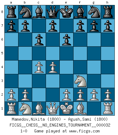 Last move : 1-0 2010 August 28 10:49:28 [Event "FICGS__CHESS__NO_ENGINES_TOURNAMENT__000032"] [Site "FICGS"] [Date "2010.07.12"] [Round "1"] [White "Mamedov,Nikita"] [Black "Agush,Sami"] [Result "1-0"] [WhiteElo "1800"] [BlackElo "1800"] 1.d4 e6 2.c4 c6 3.Nf3 1-0 This chess game has been lost on time (started : 2010.07.12 10:6:21) Queen's pawn Player White won this chess game. Follow this game move after move (download)It's always better to sacrifice your opponent's men. (Savielly Tartakover) Der Freibauer hat für mich eine Seele, genau wie der Mensch, Wünsche, die unerkannt in ihm schlummern, und Befürchtungen, von deren Existenz er selbst kaum ahnt. (Aaron Nimzowitsch) El Ajedrez es parte de la cultura, y si una cultura esta en decadencia, entonces también el Ajedrez declinará. (Mikhail Botvinnik) Un footballeur joue avec ses pieds, parfois avec sa tête. Un joueur d'échecs ne joue qu'avec sa tête. Et quand il ne joue plus, il meurt. (Jacob Murray) All battles are fought by scared men who'd rather be someplace else. (John Wayne in the movie In harm's way)