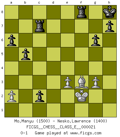 Last move : 0-1 2006 November 26 20:55:1 [Event "FICGS__CHESS__CLASS_E__000021"] [Site "FICGS"] [Date "2006.11.14"] [Round "1"] [White "Mo,Manyu"] [Black "Nesko,Lawrence"] [Result "0-1"] [WhiteElo "1500"] [BlackElo "1400"] 1.b4 Nf6 2.c3 g6 3.g3 Bg7 4.h4 d5 5.Nf3 O-O 6.e3 Bg4 7.Be2 Nbd7 8.O-O Bxf3 9.Bxf3 e5 10.Qa4 e4 11.Be2 Ne5 12.b5 Qc8 13.Kg2 c6 14.d4 exd3 15.Bd1 a6 16.Qf4 Re8 17.Na3 cxb5 18.Bd2 Ne4 19.Nb1 Nc4 20.Bc1 d2 21.Bxd2 Ncxd2 22.Nxd2 Nxd2 23.Rh1 Qc4 24.Qxc4 dxc4 25.Bg4 Bxc3 26.h5 Bxa1 27.Rxa1 Ne4 28.hxg6 fxg6 29.Rd1 Ref8 30.Be6+ Kh8 31.Rd4 Nxf2 32.Rd7 Ne4 33.Rxb7 Nc5 34.Bd5 Nxb7 35.Bxb7 Ra7 36.Bd5 Rc7 37.Bf3 c3 38.Kf2 c2 0-1 Polish (Sokolsky) opening Kingside Castling by player Black (move 5) Kingside Castling by player White (move 8) Player Black won this chess game. Follow this game move after move (download)He who fears an isolated Queen's Pawn should give up Chess. (Siegbert Tarrasch) Warum muß ich gegen diesen IDIOTEN verlieren? (Aaron Nimzowitsch) La estratégia requiere pensar, la táctica requiere observación. (Max Euwe) Que feriez-vous si vous étiez en train de jouer aux échecs et que la fin du monde arrive ? Je continuerais à jouer. (Saint Borromée) Pushing plastic is for the many, pushing virtual pieces is for the fewer, pushing wood is for the very few. (Normajean Yates)