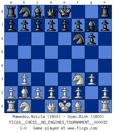Last move : 1-0 2010 July 27 0:13:51 [Event "FICGS__CHESS__NO_ENGINES_TOURNAMENT__000032"] [Site "FICGS"] [Date "2010.07.12"] [Round "1"] [White "Mamedov,Nikita"] [Black "Doan,Binh"] [Result "1-0"] [WhiteElo "1800"] [BlackElo "1800"] 1.Nf3 Nf6 2.g3 g6 3.b3 Bg7 4.Bb2 1-0 Reti : King's Indian attack Player White won this chess game. Follow this game move after move (download)The hallmark of the artist is simplicity. (Larry Evans) Bis zum Jahr 1971 verlief in meiner Schachkariere alles glatt. Dieses dramatische Match [Fischer-Taimanov 6:0] machte mein Leben zur Hölle. (Mark Taimanov) El juego del Ajedrez no es solamente una diversión quieta; algunas cualidades muy valuables de la mente se pueden adquirir y cultivar con el, como convertirlos en habitos disponibles para toda ocasión; ya que la vida es algo así como el Ajedrez. (Benjamin Franklin) On croit qu'il y a plus de mauvais joueurs que de bons joueurs, c'est faux : Il y a autant de joueurs qui gagnent que de joueurs qui perdent. (Philippe Geluck) The right perception of any matter and a misunderstanding of the same matter do not wholly exclude each other. (Kafka's the trial)