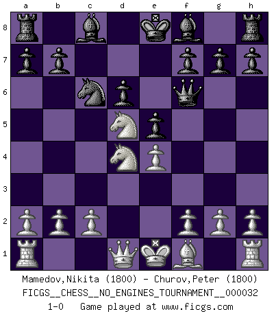 Last move : 1-0 2010 August 27 10:50:38 [Event "FICGS__CHESS__NO_ENGINES_TOURNAMENT__000032"] [Site "FICGS"] [Date "2010.07.12"] [Round "1"] [White "Mamedov,Nikita"] [Black "Churov,Peter"] [Result "1-0"] [WhiteElo "1800"] [BlackElo "1800"] 1.e4 c5 2.Nf3 d6 3.d4 cxd4 4.Nxd4 Nc6 5.Nc3 Nf6 6.Bg5 e5 7.Bxf6 Qxf6 8.Nd5 1-0 This chess game has been lost on time (started : 2010.07.12 10:6:21) Sicilian Player White won this chess game. Follow this game move after move (download)What would Chess be without silly mistakes ? (Kurt Richter) Wie ich sie so einen nach dem anderen nieder mähte wurde meine Überlegenheit offensichtlich. (José Raúl Capablanca) Algunos sacrificios son sólidos, los demás son míos. (Mikhail Tal) Il vaut mieux sacrifier les pièces de l'adversaire. (Xavier Tartacover) I would love to change the world, but they won't give me the source code. (Unknown)