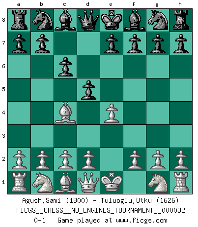 Last move : 0-1 2010 August 21 22:42:29 [Event "FICGS__CHESS__NO_ENGINES_TOURNAMENT__000032"] [Site "FICGS"] [Date "2010.07.12"] [Round "1"] [White "Agush,Sami"] [Black "Tuluoglu,Utku"] [Result "0-1"] [WhiteElo "1800"] [BlackElo "1626"] 1.e4 c6 2.Bc4 d5 0-1 This chess game has been lost on time (started : 2010.07.12 10:6:21) Caro-Kann : Hillbilly attack Player Black won this chess game. Follow this game move after move (download)Though most people love to look at the games of the great attacking masters, some of the most successful players in history have been the quiet positional players. They slowly grind you down by taking away your space, tying up your pieces, and leaving you with virtually nothing to do ! (Yasser Seirawan) Wenn du nicht weißt was du tun sollst, warte bis dein Gegner eine Idee hat. Sie wird sicher schlecht sein. (Siegbert Tarrasch) Un Peón pasado aumenta su poder a medida de que el número de piezas en el tablero disminuye. (Capablanca) Les échecs sont un jeu terrible. Si vous n'avez pas le centre, votre adversaire a une position plus libre. Par contre, si vous avez le centre, alors vous avez vraiment quelque chose pour laquelle vous inquiéter ! (Siegbert Tarrasch) Every vice is only an exaggeration of a necessary and virtuous function. (Ralph Waldo Emerson, Journals 1936)