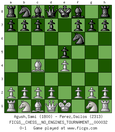 Last move : 0-1 2010 August 21 22:42:29 [Event "FICGS__CHESS__NO_ENGINES_TOURNAMENT__000032"] [Site "FICGS"] [Date "2010.07.12"] [Round "1"] [White "Agush,Sami"] [Black "Perez,Dailos"] [Result "0-1"] [WhiteElo "1800"] [BlackElo "2313"] 1.e4 e5 2.Bc4 Nf6 0-1 This chess game has been lost on time (started : 2010.07.12 10:6:21) Bishop's Opening : Berlin defense Player Black won this chess game. Follow this game move after move (download)Play the opening like a book, the middle game like a magician, and the endgame like a machine. (Spielmann) Charakterschwächen offenbaren sich normalerweise während einer Schachpartie. (Garry Kasparov) No hay precio que sea tan grande por la cabellera del Rey enemigo. (Koblentz) Shah mat. Le roi est mort. Cri de fierté d'un joueur venant de terrasser son adversaire, courtoisement, sans effusion de sang. The Internet isn't free. It just has an economy that makes no sense to capitalism. (Brad Shapcott)