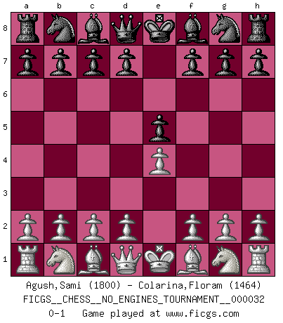 Last move : 0-1 2010 August 24 10:46:10 [Event "FICGS__CHESS__NO_ENGINES_TOURNAMENT__000032"] [Site "FICGS"] [Date "2010.07.12"] [Round "1"] [White "Agush,Sami"] [Black "Colarina,Floram"] [Result "0-1"] [WhiteElo "1800"] [BlackElo "1464"] 1.e4 e5 0-1 This chess game has been lost on time (started : 2010.07.12 10:6:21) King's pawn game Player Black won this chess game. Follow this game move after move (download)Bobby is the most misunderstood, misquoted celebrity walking the face of this earth. (Yasser Seirawan) Lisa Lane, amerikanische Schachmeisterin, hatte Fischer einmal als stärksten lebenden Spieler bezeichnet. Antwort: Das ist richtig, aber Lisa Lane ist eigentlich nicht in der Lage, das zu beurteilen. (Robert James Fischer) Un entendimiento a fondo de las continuaciones típicas del mate, hace de las combinaciones de sacrificio mas complicadas conducirlas a ellas no solo sin dificultad, sino casi de una manera natural. (Siegbert Tarrasch) Une platitude souvent récitée à propos des Echecs est qu'une des choses les plus difficiles à réaliser est de gagner une position gagnante. Cela ne manque pas de sens mais, pour ma part, j'ai toujours trouvé plus difficile de gagner une position perdante. (Tim Krabbe) There's always a bigger fish. (Qui-Gon Jinn in Star Wars ep.1)
