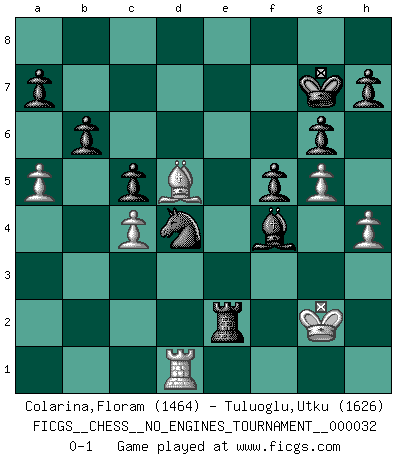 Last move : 0-1 2010 September 17 15:46:12 [Event "FICGS__CHESS__NO_ENGINES_TOURNAMENT__000032"] [Site "FICGS"] [Date "2010.07.12"] [Round "1"] [White "Colarina,Floram"] [Black "Tuluoglu,Utku"] [Result "0-1"] [WhiteElo "1464"] [BlackElo "1626"] 1.d4 d5 2.c4 e5 3.dxe5 d4 4.Nf3 Nc6 5.a3 Bg4 6.Nbd2 Nge7 7.h3 Be6 8.b3 Ng6 9.Ne4 Ngxe5 10.Nxe5 Nxe5 11.Bb2 c5 12.g3 Be7 13.Bg2 O-O 14.O-O f5 15.Nd2 Qd7 16.f4 Nc6 17.Re1 Rad8 18.Nf3 Bf6 19.Qd3 Rfe8 20.Rad1 Na5 21.e3 dxe3 22.Rxe3 Bxb2 23.Qxd7 Rxd7 24.Rde1 Rde7 25.Kh2 Nc6 26.Ng5 Bf7 27.Rxe7 Rxe7 28.Rd1 Nd4 29.Nxf7 Kxf7 30.Bd5+ Kf6 31.a4 Nxb3 32.g4 g6 33.g5+ Kg7 34.Kg2 Bc1 35.Rd3 Nd4 36.Rd1 Bxf4 37.h4 b6 38.a5 Re2+ 0-1 QGD : Albin counter-gambit Kingside Castling by player Black (move 13) Kingside Castling by player White (move 14) Player Black won this chess game. Follow this game move after move (download)It is not enough to be a good player... you must also play well. (Siegbert Tarrasch) Sehr viele beherrschen heutzutage das große Einmalseins des Schachspiels und kennen sogar dessen Logarithmentafeln auswendig - deshalb sollte man hin und wieder zu beweisen trachten, dass zwei mal zwei auch fünf sein kann. (Mikhail Nekhemyevich Tal) El sobresalir en el Ajedrez es un signo de una mente intrigante. (Sir Arthur Conan Doyle) Le temps de noter son nom sur la feuille de partie, j'étais déjà en zeitnot ! D'un modeste amateur apparié lors de la première ronde d'un open contre le grand-maître Azmaïparashvili. To err is human, but to really foul things up requires a computer. (Farmer's Almanac, 1978)