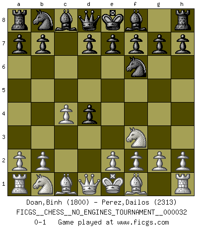 Last move : 0-1 2010 July 27 0:14:14 [Event "FICGS__CHESS__NO_ENGINES_TOURNAMENT__000032"] [Site "FICGS"] [Date "2010.07.12"] [Round "1"] [White "Doan,Binh"] [Black "Perez,Dailos"] [Result "0-1"] [WhiteElo "1800"] [BlackElo "2313"] 1.d4 Nf6 2.Nf3 c5 3.c4 cxd4 0-1 Queen's pawn game Player Black won this chess game. Follow this game move after move (download)Some part of a mistake is always correct. (Savielly Tartakover) Der Traum, für den ich lebe, ist der von einem freien Russland. Viele mögen sagen: Russland hat doch ein Parlament, einen gewählten Präsidenten. Aber ich spüre, dass in meiner Heimat die Angst wiederkehrt. Eine Angst, sich frei zu äußern, bestimmte Dinge zu tun (Garry Kasparov) El Ajedrez es parte de la cultura, y si una cultura esta en decadencia, entonces también el Ajedrez declinará. (Mikhail Botvinnik) Les Echecs sont affaire de jugement sensible. Savoir quand frapper et quand esquiver. (Fischer) For peace of mind, resign as general manager of the universe. (Douglas Adams)