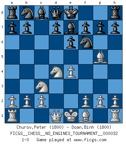 Last move : 1-0 2010 July 27 0:14:22 [Event "FICGS__CHESS__NO_ENGINES_TOURNAMENT__000032"] [Site "FICGS"] [Date "2010.07.12"] [Round "1"] [White "Churov,Peter"] [Black "Doan,Binh"] [Result "1-0"] [WhiteElo "1800"] [BlackElo "1800"] 1.d4 Nf6 2.Nc3 e6 3.Nf3 c5 4.Bg5 cxd4 5.Nxd4 Be7 6.e4 1-0 Queen's pawn game Player White won this chess game. Follow this game move after move (download)A big shock; the best chess player in history has passed away. (Lajos Portisch, about Bobby Fischer's death) In Buenos Aires ist es nicht mein vorrangiges Ziel ein starkes Turnier zu organisieren, sondern ein Turnier für Gentlemen. Ich würde nie Kamsky einladen. Ich mag keine Probleme. (Miguel Najdorf) Las piezas de Ajedrez son los bloques del alfabeto que moldean los pensamientos; y esos pensamientos, aunque hagan un diseño visual en el tablero, expresan abstractamente su belleza como un poema. (Marcel Duchamp) Les échecs, c'est la lutte contre l'erreur. (Johannes Zukertort) Thibault, I ask for draw. Game 13876. - Sorry Ilmars, you won. (FICGS chat)