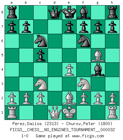 Last move : 1-0 2010 August 24 10:46:10 [Event "FICGS__CHESS__NO_ENGINES_TOURNAMENT__000032"] [Site "FICGS"] [Date "2010.07.12"] [Round "1"] [White "Perez,Dailos"] [Black "Churov,Peter"] [Result "1-0"] [WhiteElo "2313"] [BlackElo "1800"] 1.e4 c5 2.Nf3 d6 3.d4 Nf6 4.Nc3 Bg4 5.Be2 Nc6 6.dxc5 dxc5 7.Bg5 1-0 This chess game has been lost on time (started : 2010.07.12 10:6:21) Sicilian Player White won this chess game. Follow this game move after move (download)Don't even mention losing to me. I can't stand to think of it. (Bobby Fischer) Ich habe kein Problem mit Frauen, sondern nur mit dem Niveau ihres Schachspiels (Judith Polgar) El Ajedrez detiene a su maestro dentro de sus propios vínculos, encadenando la mente y el cerebro, por lo que la libertad interior del mas fuerte debe sufrir. (Albert Einstein) Le génie consiste à savoir transgresser les règles au moment opportun. (Teichmann) The arrogant army will lose certainly the battle. (Chinese proverb)