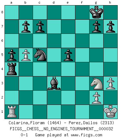 Last move : 0-1 2010 August 28 20:27:34 [Event "FICGS__CHESS__NO_ENGINES_TOURNAMENT__000032"] [Site "FICGS"] [Date "2010.07.12"] [Round "1"] [White "Colarina,Floram"] [Black "Perez,Dailos"] [Result "0-1"] [WhiteElo "1464"] [BlackElo "2313"] 1.d4 Nf6 2.c4 e6 3.Nc3 Bb4 4.Qc2 Nc6 5.Bg5 Nxd4 6.Qd3 e5 7.e4 d6 8.Nge2 Ne6 9.a3 Bxc3+ 10.Nxc3 Nxg5 11.Be2 O-O 12.O-O Ne6 13.b4 a5 14.b5 Nd7 15.a4 Ndc5 16.Qd1 Nd4 17.f4 f5 18.exf5 Bxf5 19.fxe5 dxe5 20.Kh1 Nxe2 21.Nxe2 Qxd1 22.Raxd1 Bd3 23.Rxf8+ Rxf8 24.Ng3 Rf4 25.h3 Rxc4 26.Ra1 Rxa4 0-1 Nimzo-Indian : Classical, 4...Nc6 Kingside Castling by player Black (move 11) Kingside Castling by player White (move 12) Player Black won this chess game. Follow this game move after move (download)The winner of the game is the player who makes the next-to-last mistake. (Savielly Tartakover) Es gibt keine einzige Frau, der ich nicht einen Springer vorgeben könnte und trotzdem gewänne. (Robert James Fischer) Algunos sacrificios son sólidos, los demás son míos. (Mikhail Tal) On n'a jamais que l'âge auquel on a commence à jouer aux échecs car après on cesse de vieillir. (Capablanca) I find television to be very educating. Every time somebody turns on the set, I go in the other room and read a book. (Groucho Marx)