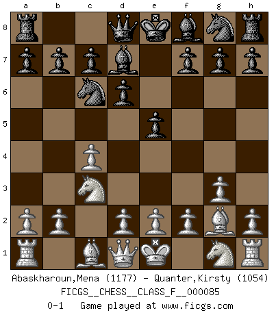 Last move : 0-1 2010 October 14 21:48:22 [Event "FICGS__CHESS__CLASS_F__000085"] [Site "FICGS"] [Date "2010.07.12"] [Round "1"] [White "Abaskharoun,Mena"] [Black "Quanter,Kirsty"] [Result "0-1"] [WhiteElo "1177"] [BlackElo "1054"] 1.c4 e5 2.Nc3 d6 3.g3 Nc6 4.Bg2 Bd7 0-1 This chess game has been lost on time (started : 2010.07.12 18:27:21) English Opening Player Black won this chess game. Follow this game move after move (download)The passed Pawn is a criminal, who should be kept under lock and key. Mild measures, such as police surveillance, are not sufficient. (Aaron Nimzovich) Pläne sind die Träume des Verständigen. (Ernst Freiherr von Feuchtersleben) Bendita sea la memoria de aquel que dio al mundo este juego inmortal. (A. G. Gardiner) Il vaut mieux sacrifier les pièces de l'adversaire. (Xavier Tartacover) If passion drives you, let reason holds the reins. (Benjamin Franklin)