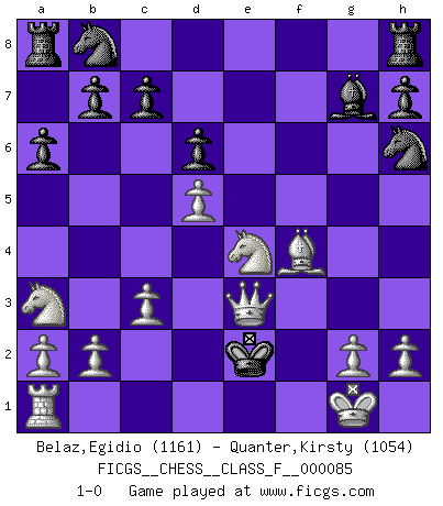 Last move : 1-0 2010 September 30 16:53:32 [Event "FICGS__CHESS__CLASS_F__000085"] [Site "FICGS"] [Date "2010.07.12"] [Round "1"] [White "Belaz,Egidio"] [Black "Quanter,Kirsty"] [Result "1-0"] [WhiteElo "1161"] [BlackElo "1054"] 1.e4 e5 2.f4 d6 3.Nf3 exf4 4.Bc4 Bg4 5.O-O a6 6.d4 f5 7.exf5 Bxf5 8.Bxf4 g5 9.Nxg5 Nh6 10.Qe1+ Qe7 11.Qc3 Bg7 12.Re1 Qxe1+ 13.Qxe1+ Kd7 14.Be6+ Bxe6 15.Qxe6+ Kc6 16.d5+ Kc5 17.Ne4+ Kd4 18.c3+ Kc4 19.Na3+ Kd3 20.Qh3+ Ke2 21.Qe3+ 1-0 King's gambit Kingside Castling by player White (move 5) Player White won this chess game. Follow this game move after move (download)You can only get good at Chess if you love the game. (Bobby Fischer) Schach ist eine Sache der genauen Beurteilung, wann man zuschlagen und wann man sich ducken muss. (Robert James Fischer) El Ajedrez lo es todo: arte, ciencia y deporte. (Anatoly Karpov) Les échecs sont un jeu terrible. Si vous n'avez pas le centre, votre adversaire a une position plus libre. Par contre, si vous avez le centre, alors vous avez vraiment quelque chose pour laquelle vous inquiéter ! (Siegbert Tarrasch) Every vice is only an exaggeration of a necessary and virtuous function. (Ralph Waldo Emerson, Journals 1936)