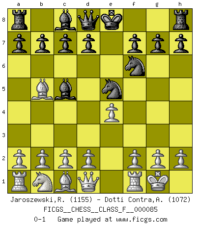 Last move : 0-1 2010 August 23 19:14:42 [Event "FICGS__CHESS__CLASS_F__000085"] [Site "FICGS"] [Date "2010.07.12"] [Round "1"] [White "Jaroszewski,Rodrigo"] [Black "Dotti Contra,Alessandro"] [Result "0-1"] [WhiteElo "1155"] [BlackElo "1072"] 1.e4 e5 2.Nf3 Nc6 3.Bb5 Nf6 4.O-O Bc5 5.Nxe5 Nxe5 0-1 Ruy Lopez : Berlin defense, Beverwijk variation Kingside Castling by player White (move 4) Player Black won this chess game. Follow this game move after move (download)When you see a good move, look for a better one. (Emanuel Lasker) Der Freibauer hat für mich eine Seele, genau wie der Mensch, Wünsche, die unerkannt in ihm schlummern, und Befürchtungen, von deren Existenz er selbst kaum ahnt. (Aaron Nimzowitsch) Es el objetivo de la escuela moderna no tratar cada posición de acuerdo a una regla general, sino de acuerdo al principio inherente en la posición. (Richard Reti) Les réformistes prétendent que les progrès de la théorie conduiront à la disparition des échecs, et qu'il faut, pour leur rendre vie, en remanier les règles. En réalité, qu'exprime cette affirmation? Le mépris de l'intuition, de l'imagination et de tous les autres éléments qui font des échecs un art. (Alexander Alekhine) Always two there are. No more no less. A master, and an apprentice. (Master Yoda in Star Wars ep.1)
