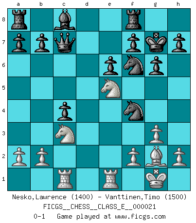 Last move : 0-1 2006 December 3 14:16:26 [Event "FICGS__CHESS__CLASS_E__000021"] [Site "FICGS"] [Date "2006.11.14"] [Round "1"] [White "Nesko,Lawrence"] [Black "Vanttinen,Timo"] [Result "0-1"] [WhiteElo "1400"] [BlackElo "1500"] 1.d4 Nf6 2.Nf3 g6 3.g3 Bg7 4.Bg2 O-O 5.O-O d6 6.c4 Nc6 7.d5 Nb8 8.Nc3 c6 9.Be3 e6 10.Qc1 cxd5 11.Bh6 dxc4 12.e4 Nbd7 13.Bxg7 Kxg7 14.Re1 Nb6 15.e5 dxe5 16.Nxe5 Qc7 17.Qf4 Nbd5 18.Rac1 Nxf4 0-1 King's Indian : Fianchetto without c4 Kingside Castling by player Black (move 4) Kingside Castling by player White (move 5) Player Black won this chess game. Follow this game move after move (download)With or without the title, Bobby Fischer was unquestionably the greatest player of his time. (Burt Hochberg) Im Schach gewinnt jeder. Hat man Freunde am Spiel - und das ist die Hauptsache - ist auch der Verlust einer Partie kein Unglück. (David Bronstein) Morphy probablemente fue el genio más grande de todos. (Bobby Fischer) L'attaque fait le spectacle, la défense gagne les matchs. (Dicton footballistique) When a man with money meets a man with experience, the man with experience leaves with money and the man with money leaves with experience. (Anonymous)