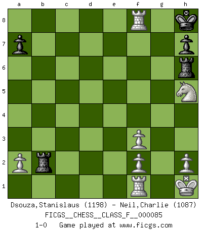 Last move : 1-0 2010 August 23 12:38:12 [Event "FICGS__CHESS__CLASS_F__000085"] [Site "FICGS"] [Date "2010.07.12"] [Round "1"] [White "Dsouza,Stanislaus"] [Black "Neil,Charlie"] [Result "1-0"] [WhiteElo "1198"] [BlackElo "1087"] 1.Nf3 c5 2.Nc3 Nc6 3.d4 cxd4 4.Nxd4 Nf6 5.e3 e6 6.Nxc6 bxc6 7.Bd3 d5 8.O-O c5 9.Bb5+ Bd7 10.Bxd7+ Qxd7 11.Qf3 Bd6 12.e4 O-O 13.exd5 exd5 14.Bg5 Qg4 15.Bxf6 Qxf3 16.gxf3 gxf6 17.Kh1 d4 18.Ne4 Be5 19.Rad1 Kh8 20.Nxc5 Rg8 21.Nd7 Bf4 22.Rxd4 Rg6 23.Rxf4 Rc8 24.Nxf6 Rxc2 25.Nh5 Rxb2 26.Rxf7 Rh6 27.Rf8+ 1-0 Reti Opening Kingside Castling by player White (move 8) Kingside Castling by player Black (move 12) Player White won this chess game. Follow this game move after move (download)One doesn't have to play well, it's enough to play better than your opponent. (Siegbert Tarrasch) Bis zum Jahr 1971 verlief in meiner Schachkariere alles glatt. Dieses dramatische Match [Fischer-Taimanov 6:0] machte mein Leben zur Hölle. (Mark Taimanov) Solo los afeminados hacen el Enroque. (Rob Sillars) Le thème de l'attaque double intervient d'une manière ou d'une autre dans l'immense majorité des combinaisons. (Youri Averbakh) Experience is the name we all give to our mistakes. (Oscar Wilde)