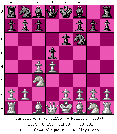Last move : 0-1 2010 August 23 19:14:12 [Event "FICGS__CHESS__CLASS_F__000085"] [Site "FICGS"] [Date "2010.07.12"] [Round "1"] [White "Jaroszewski,Rodrigo"] [Black "Neil,Charlie"] [Result "0-1"] [WhiteElo "1155"] [BlackElo "1087"] 1.d4 d5 2.c4 e6 3.Nc3 Nf6 0-1 QGD : 3...Nf6 Player Black won this chess game. Follow this game move after move (download)We cannot resist the fascination of sacrifice, since a passion for sacrifices is part of a Chessplayer's nature. (Rudolf Spielman) Viele Opfer benötigen überhaupt keine konkrete Berechnung. Es genügt sich die entstehende Position kurz vorzustellen, um uns davon zu überzeugen, dass das Opfer korrekt ist. (Mikhail Nekhemyevich Tal) Si pudieramos observar el interior de la cabeza de un jugador de Ajedrez, encontraríamos ahí un mundo lleno de sentimientos, imágenes, ideas, emoción y pasión. (Alfred Binet) Pour moi, les échecs ne sont pas un jeu mais un art. (Alexandre Alekhine) The problem with manipulation is that people can turn on you. (Horatio Caine, C.S.I. Miami)