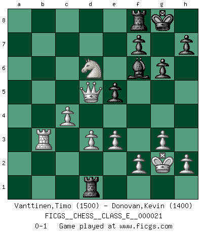 Last move : 0-1 2007 April 26 18:50:50 [Event "FICGS__CHESS__CLASS_E__000021"] [Site "FICGS"] [Date "2006.11.14"] [Round "1"] [White "Vanttinen,Timo"] [Black "Donovan,Kevin"] [Result "0-1"] [WhiteElo "1500"] [BlackElo "1400"] 1.c4 e5 2.Nc3 d6 3.g3 Nf6 4.Bg2 g6 5.d3 c5 6.Bg5 Bg7 7.e3 O-O 8.Nge2 Qa5 9.Bxf6 Bxf6 10.O-O a6 11.Nd5 Bd8 12.a3 Nc6 13.b4 cxb4 14.axb4 Qxa1 15.Qxa1 a5 16.bxa5 Rxa5 17.Qb2 Be6 18.Qxb7 Bxd5 19.Bxd5 Ne7 20.Rb1 Ra3 21.Rb3 Ra1+ 22.Kg2 Ra2 23.Nc3 Rd2 24.Ne4 Rd1 25.Nxd6 Nxd5 26.Qxd5 Bf6 0-1 English Opening Kingside Castling by player Black (move 7) Kingside Castling by player White (move 10) Player Black won this chess game. Follow this game move after move (download)Pawns: they are the soul of this game, they alone form the attack and defense. (Philidor) Glücklicherweise sind Großmeister Ruben Fines reine Schachbücher weniger phallozentrisch [als seine Schachpsychologie] und deswegen auch weniger lächerlich. (Nigel Short) Buenas posiciones no logran ganar juegos, buenas movidas sí. (Gerald Abrahams) Le profane ne songe pas à la somme de jouissance dont il se prive, qui méconnaît ce jeu aux ressources aussi variées que passionnantes. (Jean-Marie Jeanton-Lamarche) Being number two sucks. (Andre Agassi)