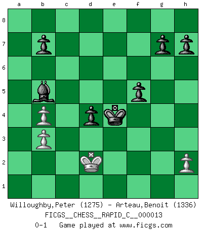 Last move : 0-1 2006 December 30 19:7:17 [Event "FICGS__CHESS__RAPID_C__000013"] [Site "FICGS"] [Date "2006.11.14"] [Round "1"] [White "Willoughby,Peter"] [Black "Arteau,Benoit"] [Result "0-1"] [WhiteElo "1275"] [BlackElo "1336"] 1.e4 c5 2.Nf3 Nf6 3.e5 Nd5 4.d4 e6 5.Bc4 Nc6 6.O-O Nb6 7.Qd3 cxd4 8.Bf4 d5 9.Bb5 Bd7 10.Bxc6 Bxc6 11.Qxd4 Nd7 12.Bg5 Qb6 13.Qxb6 Nxb6 14.Nc3 Rc8 15.Be3 Bb4 16.Ne2 Bb5 17.c3 Bxe2 18.Rfe1 Bxf3 19.cxb4 Be4 20.Bxb6 axb6 21.a3 Rc2 22.f3 Bg6 23.Rac1 Kd7 24.Rxc2 Bxc2 25.Rc1 Rc8 26.g3 Bb3 27.Rxc8 Kxc8 28.f4 Kc7 29.Kf2 d4 30.Ke2 Kc6 31.Kd2 Kd5 32.Kd3 b5 33.g4 Bc4+ 34.Kd2 Ke4 35.f5 exf5 36.gxf5 Kxe5 37.Kc2 Kxf5 38.b3 Bf1 39.a4 Ke4 40.axb5 Bxb5 41.Kd2 f5 0-1 Sicilian : Nimzovich-Rubinstein variation Kingside Castling by player White (move 6) Player Black won this chess game. Follow this game move after move (download)Bobby Fischer is the greatest Chess player who has ever lived. (Ken Smith) Ich habe Putins Aufstieg an die Macht beobachtet und seine Politik, die demokratischen Institutionen meines Landes zu zerstören. (Garry Kasparov) Los finales de Peón son del Ajedrez lo que el cesped es del Golf. (Cecil Purdy) Les Echecs ont trois composantes : le temps, l'espace et le matériel en dernier. (Mikhail Tal) Even the best needles are not sharp at both ends. (Chinese proverb)