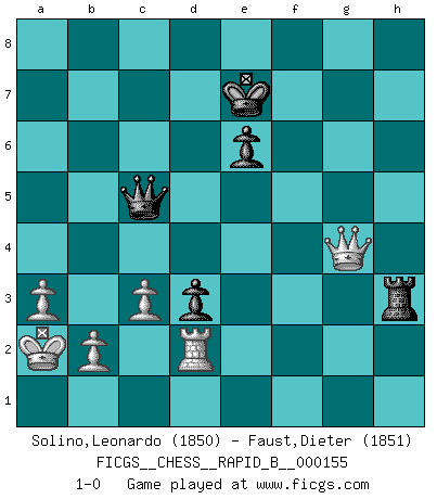 Last move : 1-0 2010 October 25 15:8:32 [Event "FICGS__CHESS__RAPID_B__000155"] [Site "FICGS"] [Date "2010.07.13"] [Round "1"] [White "Solino,Leonardo"] [Black "Faust,Dieter"] [Result "1-0"] [WhiteElo "1850"] [BlackElo "1851"] 1.e4 Nf6 2.e5 Nd5 3.d4 d6 4.Nf3 dxe5 5.Nxe5 g6 6.Bc4 c6 7.Nc3 Be6 8.Ne4 Nc7 9.Bxe6 Nxe6 10.Qf3 f6 11.Qb3 Qd5 12.Qxb7 Qxe4+ 13.Be3 fxe5 14.Qxa8 Kf7 15.Qxb8 Bg7 16.Qb4 Qxg2 17.O-O-O exd4 18.Bd2 Qd5 19.Qa3 Rb8 20.h4 d3 21.c3 a5 22.h5 g5 23.h6 Be5 24.Kb1 c5 25.Qa4 c4 26.Rhe1 Bd6 27.Be3 Kg6 28.Rd2 Be5 29.Ka1 Kxh6 30.Qd1 Kg7 31.Qh5 h6 32.Rh1 Rh8 33.Re1 a4 34.a3 Kf6 35.f4 Nxf4 36.Rf2 e6 37.Ka2 Qd6 38.Qf3 h5 39.Rg1 g4 40.Rxg4 hxg4 41.Qxg4 Ke7 42.Bxf4 Qd5 43.Bxe5 Qxe5 44.Qxc4 Qd6 45.Rd2 Rh3 46.Qxa4 Qc5 47.Qg4 1-0 Alekhine's defense : Modern, Larsen variation Queenside Castling by player White (move 17) Player White won this chess game. Follow this game move after move (download)I played Chess with him and would have beaten him sometimes only he always took back his last move, and ran the game out differently. (Mark Twain) Wie gewinnt Tal? Er entwickelt alle seine Figuren in die Brettmitte und opfert sie dann irgendwo. (Robert James Fischer) Tu sabes que vas a perder. Aún cuando tenía la ventaja, yo sabía que iba a perder. - al estar jugando con Fischer (Andrew Soltis) Lorsque vous vous retrouvez devant une position atroce, ne tendez pas un ultime piège dérisoire avec l'intention d'abandonner si l'adversaire le déjoue ! Faites-vous plutôt un devoir de résister comme si votre vie en dépendait. Jouez le coup qui vous déplairait au centuple si vous étiez dans la peau de votre tortionnaire ! However beautiful the strategy, you should occasionally look at the results. (Winston Churchill)