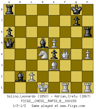 Last move : 1/2-1/2 2010 October 17 8:19:22 [Event "FICGS__CHESS__RAPID_B__000155"] [Site "FICGS"] [Date "2010.07.13"] [Round "1"] [White "Solino,Leonardo"] [Black "Adrian,Cretu"] [Result "1/2-1/2"] [WhiteElo "1850"] [BlackElo "1867"] 1.e4 c5 2.Nf3 d6 3.d4 cxd4 4.Nxd4 Nf6 5.Nc3 a6 6.Be3 e6 7.f3 b5 8.Qd2 Nbd7 9.g4 h6 10.O-O-O Bb7 11.h4 b4 12.Na4 Qa5 13.b3 Nc5 14.a3 Nxa4 15.axb4 Qc7 16.bxa4 d5 17.e5 Nd7 18.f4 Nb6 19.f5 Nxa4 20.fxe6 Nc3 21.exf7+ Kxf7 22.Bd3 Bxb4 23.Rdf1+ Kg8 24.Qf2 Ba3+ 25.Kd2 Ne4+ 26.Bxe4 dxe4 27.g5 Bd5 28.gxh6 Qa5+ 29.Kd1 Bb2 30.Qf4 Rxh6 1/2-1/2 Sicilian : Najdorf, Byrne (English) attack Queenside Castling by player White (move 10) This chess game ended in a draw. Follow this game move after move (download)In a gambit you give up a Pawn for the sake of getting a lost game. (Samuel Standige Boden) Sehr viele beherrschen heutzutage das große Einmalseins des Schachspiels und kennen sogar dessen Logarithmentafeln auswendig - deshalb sollte man hin und wieder zu beweisen trachten, dass zwei mal zwei auch fünf sein kann. (Mikhail Nekhemyevich Tal) Un mal día en el Ajedrez, es mejor que cualquier buen día en el trabajo. (Anonymous) Ce qui est bien, c'est d'avoir tout un tas de pièces en prise : l'adversaire ne peut en prendre qu'une à la fois. Cité par Thierry Audin. If only faces could talk... (Pat Summerall, Sportscaster during the Super Bowl)