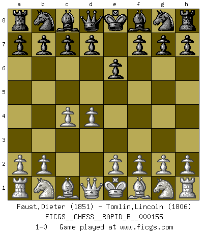 Last move : 1-0 2010 August 14 22:39:17 [Event "FICGS__CHESS__RAPID_B__000155"] [Site "FICGS"] [Date "2010.07.13"] [Round "1"] [White "Faust,Dieter"] [Black "Tomlin,Lincoln"] [Result "1-0"] [WhiteElo "1851"] [BlackElo "1806"] 1.d4 e6 2.c4 1-0 This chess game has been lost on time (started : 2010.07.13 15:10:40) Queen's pawn Player White won this chess game. Follow this game move after move (download)A man without frontiers. He didn't divide the East and the West, he brought them together in their admiration for him. (Ljubomir Ljubojevic, about Bobby Fischer's death) Ich bin es gewohnt, das die Jugend mir überhaupt keinen Respekt entgegenbringt. (Alexander Morozewich) Si tu oponente te ofrece un empate, trata de averiguar porque piensa él que esta en una posición peor. (Nigel Short) Les échecs, c'est l'art d'analyser. (Mikhail Botvinnik) Memory is a way of holding onto the things you love, the things you are, the things you never want to lose. (from the television show: The Wonder Years)