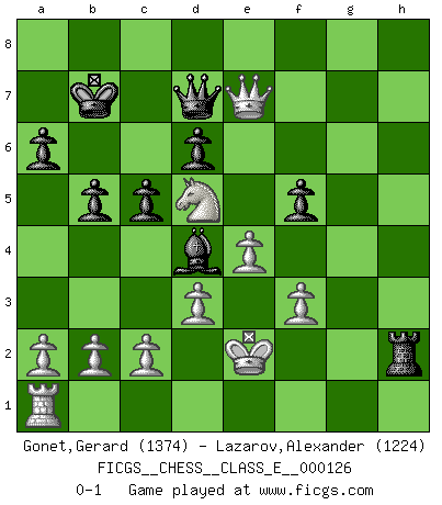 Last move : 0-1 2010 July 31 15:50:27 [Event "FICGS__CHESS__CLASS_E__000126"] [Site "FICGS"] [Date "2010.07.14"] [Round "1"] [White "Gonet,Gerard"] [Black "Lazarov,Alexander"] [Result "0-1"] [WhiteElo "1374"] [BlackElo "1224"] 1.f4 d6 2.e4 c5 3.Nf3 Nc6 4.Bc4 Bg4 5.Bxf7+ Kd7 6.f5 Nf6 7.Be6+ Kc7 8.Nc3 a6 9.d3 b5 10.O-O Nd4 11.h3 Bxf3 12.gxf3 Nxe6 13.fxe6 Qc8 14.Bg5 Qxe6 15.Bxf6 Qxh3 16.Nd5+ Kb7 17.Rf2 gxf6 18.Rh2 Qd7 19.Kf2 f5 20.Qh1 Bg7 21.Rxh7 Bd4+ 22.Ke2 Rxh7 23.Qxh7 Rh8 24.Qxe7 Rh2+ 0-1 Bird's Opening Kingside Castling by player White (move 10) Player Black won this chess game. Follow this game move after move (download)I play correspondence chess because it is both art and science while chess is art only. (A player at FICGS) Wenn ich einen Club besuche, sind die Spieler stumm vor Staunen. (José Raúl Capablanca) Los libros de Ajedrez deben de usarse igual como usamos los anteojos: para mejorar la vista, aunque algunos jugadores los quieren usar como si ellos les otorgaran la vision. (José Raúl Capablanca) Le temps de noter son nom sur la feuille de partie, j'étais déjà en zeitnot ! D'un modeste amateur apparié lors de la première ronde d'un open contre le grand-maître Azmaïparashvili. The question of whether computers can think is just like question of whether submarines can swim. (Edsger W. Dijkstra)