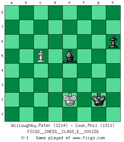Last move : 0-1 2010 August 8 10:49:1 [Event "FICGS__CHESS__CLASS_E__000126"] [Site "FICGS"] [Date "2010.07.14"] [Round "1"] [White "Willoughby,Peter"] [Black "Cook,Phil"] [Result "0-1"] [WhiteElo "1214"] [BlackElo "1311"] 1.e4 e5 2.f4 d6 3.Bc4 Nh6 4.Nf3 Be6 5.O-O Bxc4 6.d3 Ba6 7.fxe5 dxe5 8.Nxe5 f6 9.Nc4 Nc6 10.Bxh6 Bxc4 11.Bxg7 Bxg7 12.dxc4 O-O 13.Nd2 Qd4+ 14.Kh1 Ne5 15.c3 Qb6 16.b3 Nd3 17.Qe2 Rae8 18.Qxd3 Rd8 19.Qe2 Qe6 20.Qe3 Rfe8 21.Nf3 Qxe4 22.Qxe4 Rxe4 23.Rfe1 Rde8 24.Rxe4 Rxe4 25.Rc1 Re3 26.Kg1 Re2 27.a3 Kf7 28.Nd4 Re4 29.Kf2 Bh6 30.Re1 Rxe1 31.Kxe1 c6 32.b4 a6 33.c5 Bf8 34.Nf5 Ke6 35.g4 Be7 36.Ke2 Bd8 37.h4 Kd5 38.Kd3 a5 39.c4+ Ke5 40.Ne3 axb4 41.axb4 b6 42.cxb6 Bxb6 43.c5 Bc7 44.Ng2 h6 45.Ke3 Bd8 46.h5 f5 47.gxf5 Kxf5 48.Nf4 Bg5 49.b5 Bxf4+ 50.Kd4 Be5+ 51.Kc4 cxb5+ 52.Kxb5 Kg5 53.Kc4 Kxh5 54.Kd3 Kg4 55.Ke3 Kg3 56.Ke2 Kg2 0-1 King's gambit Kingside Castling by player White (move 5) Kingside Castling by player Black (move 12) 10 pieces endgame at move 47 : White KNPPPP , Black KBPP WHITE : King + 1 Knight 4 Pawns BLACK : King + 1 Bishop 2 Pawns 9 pieces endgame at move 47 : White KNPPP , Black KBPP WHITE : King + 1 Knight 3 Pawns BLACK : King + 1 Bishop 2 Pawns 8 pieces endgame at move 49 : White KPPP , Black KBPP WHITE : King + 3 Pawns BLACK : King + 1 Bishop 2 Pawns 7 pieces endgame at move 51 : White KPP , Black KBPP WHITE : King + 2 Pawns BLACK : King + 1 Bishop 2 Pawns 6 pieces endgame at move 52 : White KPP , Black KBP WHITE : King + 2 Pawns BLACK : King + 1 Bishop 1 Pawn 5 pieces endgame at move 53 : White KP , Black KBP WHITE : King + 1 Pawn BLACK : King + 1 Bishop 1 Pawn Player Black won this chess game. Follow this game move after move (download)Chess opens and enriches your mind. (Saudin Robovic) Fischer: 'Remis!?' Uhlmann: 'Aber es muss doch dreimal Zugwiederholung sein!' Fischer: 'Sie nehmen das Remis an, wie ich es sage, sonst spiele ich weiter und werde Sie dann schlagen!' (Robert James Fischer) Aunque la mayoría de la gente disfruta observar las partidas de los grandes Maestros de ataque, algunos de los jugadores mas notables en la historia han sido los jugadores silenciosos posicionales. Lentamente ellos te aplastan despojandote de tu espacio, congestionando tus piezas y dejandote virtualmente sin nada que hacer. (Yasser Seirawan) Si le désir cupide (et stupide) de gagner est une inépuisable source de souffrance, une combinaison brillante sur l'échiquier est une découverte : le coquelicot qui s'épanouit lorsque apparaît la Voie Lactée. (Arrabal) Hold em is to stud what chess is to checkers. (Johnny Moss)