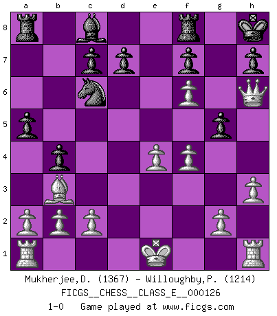 Last move : 1-0 2010 August 5 0:0:52 [Event "FICGS__CHESS__CLASS_E__000126"] [Site "FICGS"] [Date "2010.07.14"] [Round "1"] [White "Mukherjee,Deepankar"] [Black "Willoughby,Peter"] [Result "1-0"] [WhiteElo "1367"] [BlackElo "1214"] 1.e4 e5 2.Nf3 Nc6 3.Bc4 Nf6 4.Nc3 Be7 5.d4 O-O 6.dxe5 Ng4 7.Bf4 a6 8.h3 Nh6 9.Bxh6 gxh6 10.Qd2 b5 11.Bb3 b4 12.Nd5 Bg5 13.Nxg5 hxg5 14.f4 Kh8 15.Nf6 a5 16.Qe2 Kg7 17.Qh5 Qxf6 18.exf6+ Kh8 19.Qh6 1-0 Two knights defense Kingside Castling by player Black (move 5) Player White won this chess game. Follow this game move after move (download)You know, comrade Pachman, I don't enjoy being a Minister, I would rather play Chess like you. (Che Guevara) Warum muß ich gegen diesen IDIOTEN verlieren? (Aaron Nimzowitsch) Yo no creo en la psicología. Yo creo en las buenas movidas. (Bobby Fischer) Que feriez-vous si vous étiez en train de jouer aux échecs et que la fin du monde arrive ? Je continuerais à jouer. (Saint Borromée) CHESS, n. f. [echecs, Fr.] A nice and abstruse game, in which two sets of puppets are moved in opposition to each other. (Dr Samuel Johnson, A Dictionary Of The English Language, 1755)