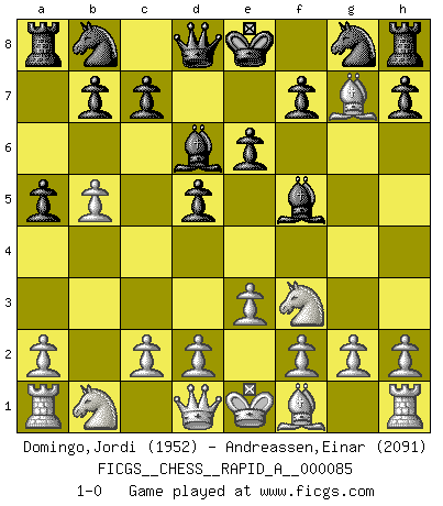 Last move : 1-0 2010 July 21 20:51:28 [Event "FICGS__CHESS__RAPID_A__000085"] [Site "FICGS"] [Date "2010.07.14"] [Round "1"] [White "Domingo,Jordi"] [Black "Andreassen,Einar"] [Result "1-0"] [WhiteElo "1952"] [BlackElo "2091"] 1.b4 a5 2.b5 d5 3.Bb2 Bf5 4.e3 e6 5.Nf3 Bd6 6.Bxg7 1-0 Polish (Sokolsky) opening Player White won this chess game. Follow this game move after move (download)There is only one thing Fischer does in Chess without pleasure: to lose ! (Boris Spassky) Ich habe Putins Aufstieg an die Macht beobachtet und seine Politik, die demokratischen Institutionen meines Landes zu zerstören. (Garry Kasparov) El Ajedrez expande y enriquece tu mente. (Saudin Robovic) Ne tendez aucun piège pour le plaisir ! Ne jouez rien dans l'espoir que l'adversaire réagisse de façon stupide ! Prenez toujours pour acquis que l'adversaire va trouver le meilleur coup ! Ne jouez jamais de coup dans l'espoir que l'adversaire ne voie pas la menace ! Chacun de vos coups doit améliorer la position d'une façon ou d'une autre. I've never seen so many men wasted so badly. (Blondie in The Good, The Bad and The Ugly)