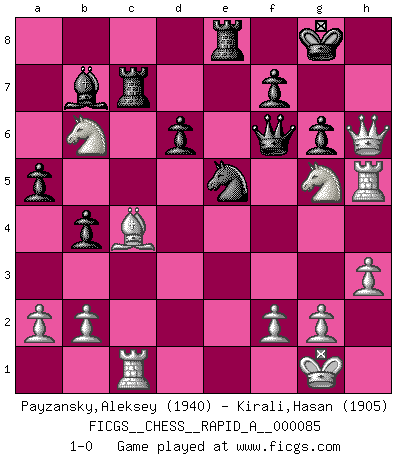 Last move : 1-0 2010 August 29 18:21:30 [Event "FICGS__CHESS__RAPID_A__000085"] [Site "FICGS"] [Date "2010.07.14"] [Round "1"] [White "Payzansky,Aleksey"] [Black "Kirali,Hasan"] [Result "1-0"] [WhiteElo "1940"] [BlackElo "1905"] 1.e4 Nc6 2.Nf3 d6 3.d4 Nf6 4.Nc3 g6 5.d5 Nb8 6.Bc4 Bg7 7.O-O O-O 8.h3 c6 9.Re1 b5 10.Bb3 b4 11.Na4 Bb7 12.Bg5 Nbd7 13.Qd2 a5 14.Rac1 Rc8 15.c3 cxd5 16.exd5 Re8 17.c4 Rc7 18.Bh6 Bxh6 19.Qxh6 Ba6 20.Ng5 Ne5 21.Re4 e6 22.Rh4 exd5 23.Nxh7 dxc4 24.Ng5 Nh5 25.Nb6 Bb7 26.Bxc4 Qf6 27.Rxh5 1-0 KP : Nimzovich defense Kingside Castling by player White (move 7) Kingside Castling by player Black (move 7) Player White won this chess game. Follow this game move after move (download)Why must I lose to this idiot ? (Aron Nimzovich) Weshalb minderdergeübte Spieler mit g2-g4 beginnen? Die betreffenden sind unschlüssig, ob sie nun rechts (h4) oder links (f4) beginnen sollen, und in ihrer Ratlosigkeit entschliessen sie sich nach guter Bürgerart dazu, den goldenen Mittelweg zu wählen. (Aaron Nimzowitsch) Peones: ellos son el alma de esta partida, solos forman el ataque y la defensa. (Philidor) Le système Elo représente seulement une moyenne. Il est simplement un indicateur de votre stabilité. (Anatoli Karpov) If everyone is thinking alike, then somebody isn't thinking. (US General George S. Patton)