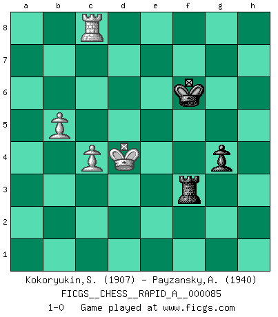 Last move : 1-0 2010 August 1 13:8:32 [Event "FICGS__CHESS__RAPID_A__000085"] [Site "FICGS"] [Date "2010.07.14"] [Round "1"] [White "Kokoryukin,Sergey"] [Black "Payzansky,Aleksey"] [Result "1-0"] [WhiteElo "1907"] [BlackElo "1940"] 1.e4 c5 2.Nf3 d6 3.d4 cxd4 4.Nxd4 Nf6 5.Nc3 g6 6.Be3 Bg7 7.f3 O-O 8.Qd2 Nc6 9.O-O-O d5 10.Nxc6 bxc6 11.exd5 Nxd5 12.Bd4 Nxc3 13.Qxc3 Bh6+ 14.Be3 Bxe3+ 15.Qxe3 Qb6 16.Qxe7 Be6 17.Qa3 Rad8 18.Re1 Rd4 19.h4 h5 20.g4 Qc7 21.Qe3 Rfd8 22.Be2 hxg4 23.h5 Qf4 24.Qxf4 Rxf4 25.hxg6 fxg6 26.fxg4 Bxg4 27.Rh4 R8d4 28.Rxg4 Rxg4 29.Bxg4 Rxg4 30.Re6 a5 31.Rxc6 Kf7 32.b3 a4 33.Kd2 g5 34.Ke2 axb3 35.axb3 Ke7 36.c3 Rf4 37.Ke3 Rf1 38.b4 g4 39.b5 Rf5 40.c4 Kf7 41.Rc7+ Kf6 42.Rc8 Rf3+ 43.Kd4 1-0 Sicilian : Dragon, Yugoslav attack, 7...O-O Kingside Castling by player Black (move 7) Queenside Castling by player White (move 9) 10 pieces endgame at move 29 : White KRPPP , Black KRPPP WHITE : King + 1 Rook 3 Pawns BLACK : King + 1 Rook 3 Pawns 9 pieces endgame at move 31 : White KRPPP , Black KRPP WHITE : King + 1 Rook 3 Pawns BLACK : King + 1 Rook 2 Pawns 8 pieces endgame at move 34 : White KRPP , Black KRPP WHITE : King + 1 Rook 2 Pawns BLACK : King + 1 Rook 2 Pawns 7 pieces endgame at move 35 : White KRPP , Black KRP WHITE : King + 1 Rook 2 Pawns BLACK : King + 1 Rook 1 Pawn Player White won this chess game. Follow this game move after move (download)Becoming successful at Chess allows you to discover your own personality. That's what I want for the kids I teach. (Saudin Robovic) Rubinstein ist ein Turmendspiel, welches die Götter vor tausenden von Jahren begannen. (Savielly Grigorievitsch Tartakower) Sin errores no puede haber brillantez. (Emanuel Lasker) Ce qui est bien, c'est d'avoir tout un tas de pièces en prise : l'adversaire ne peut en prendre qu'une à la fois. Cité par Thierry Audin. There is a computer disease that anybody who works with computers knows about. It's a very serious disease and it interferes completely with the work. The trouble with computers is that you 'play' with them ! (Richard P. Feynman)