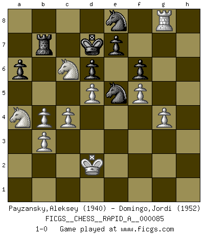Last move : 1-0 2010 November 28 16:34:36 [Event "FICGS__CHESS__RAPID_A__000085"] [Site "FICGS"] [Date "2010.07.14"] [Round "1"] [White "Payzansky,Aleksey"] [Black "Domingo,Jordi"] [Result "1-0"] [WhiteElo "1940"] [BlackElo "1952"] 1.e4 h6 2.d4 a6 3.Nf3 d6 4.Nc3 g5 5.Be3 g4 6.Nd2 Bg7 7.Be2 Nc6 8.Nc4 b5 9.d5 Nb8 10.Nd2 Nf6 11.a3 h5 12.h3 c5 13.hxg4 Nxg4 14.Bf4 Qc7 15.Bf3 Bd4 16.Bg3 c4 17.Kf1 Qc5 18.Qe2 Rg8 19.e5 Bxe5 20.Nde4 Qb6 21.Bxe5 Nxe5 22.Bxh5 Kd8 23.f4 Bg4 24.Qe1 Nf3 25.Qf2 Qxf2+ 26.Kxf2 Bxh5 27.Rxh5 Nd4 28.Rc1 Nd7 29.Ke3 b4 30.axb4 Nb5 31.Ra1 Nc7 32.Kd4 Nb6 33.g3 Kd7 34.Rh7 Raf8 35.f5 Rg4 36.Re1 f6 37.Reh1 Rfg8 38.R1h6 Kd8 39.Rh8 R4g7 40.Rxg8+ Rxg8 41.Rh1 Kd7 42.Rh7 Kd8 43.Rh3 Kd7 44.Nf2 Nb5+ 45.Ke4 Nc7 46.g4 Kd8 47.Rh4 Nd7 48.Nfd1 Ne5 49.Ne3 Kd7 50.Na4 Rb8 51.c3 Nf7 52.Rh5 Ng5+ 53.Kf4 Nf7 54.Rh1 Rb5 55.Ke4 Ke8 56.Kd4 Ne5 57.Rh8+ Kd7 58.Rf8 Ne8 59.Ke4 Nc7 60.Nc2 Ne8 61.Nd4 Rb8 62.Rh8 Kc7 63.Ne6+ Kd7 64.Rg8 Nf7 65.Kd4 Rb5 66.Kxc4 Nc7 67.Nf8+ Ke8 68.Ng6 Kd7 69.Nf4 Ne5+ 70.Kd4 Nf3+ 71.Ke3 Ne5 72.b3 Nf7 73.Ke2 Ng5 74.Ne6 Ne8 75.Nd4 Rb7 76.Nc6 Nf7 77.c4 Ne5 78.Kd2 1-0 Carr's defense Player White won this chess game. Follow this game move after move (download)One of these modest little moves may be more embarrassing to your opponent than the biggest threat. (Siegbert Tarrasch) Im Wettkampf zwischen starken Meistern kommen Fehler sehr selten vor, deshalb ist es mit bloßem Warten nicht getan. (José Raúl Capablanca) Tu sabes, camarada Pachman, no disfruto el ser un Ministro, preferería jugar al Ajedrez como tu. (Che Guevara) À la honte des hommes, on sait que les lois du jeu sont les seules qui soient partout justes, claires, inviolables et exécutées. Pourquoi l'Indien qui a donné les règles du jeu d'échecs est-il obéi de bon gré dans toute la terre, et que les décrétales des papes, par exemple, sont aujourd'hui un objet d'horreur et de mépris ? C'est que l'inventeur des échecs combina tout avec justesse pour la satisfaction des joueurs, et que les papes, dans leurs décrétales, n'eurent en vue que leur seul avantage. L'Indien voulut exercer également l'esprit des hommes et leur donner du plaisir; les papes ont voulu abrutir l'esprit des hommes. Voltaire (Dictionnaire philosophique / Garnier 1967) Somehow our devils are never quite what we expect when we meet them face to face. (Nelson DeMille)