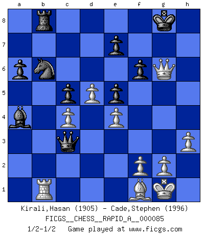 Last move : 1/2-1/2 2010 September 1 20:26:26 [Event "FICGS__CHESS__RAPID_A__000085"] [Site "FICGS"] [Date "2010.07.14"] [Round "1"] [White "Kirali,Hasan"] [Black "Cade,Stephen"] [Result "1/2-1/2"] [WhiteElo "1905"] [BlackElo "1996"] 1.e4 g6 2.d4 Bg7 3.Nc3 d6 4.Be3 a6 5.Nf3 b5 6.Bd3 Bb7 7.Qd2 Nd7 8.a4 b4 9.Ne2 c5 10.Ng3 Ngf6 11.c3 h5 12.Bg5 bxc3 13.bxc3 Qa5 14.Rb1 Rb8 15.h3 O-O 16.O-O Bc6 17.d5 Rxb1 18.Rxb1 Bxa4 19.Qe2 Rb8 20.Ra1 Nb6 21.Rb1 Nfd7 22.c4 Bf6 23.Bf4 Ne5 24.Nxe5 Bxe5 25.Bxe5 dxe5 26.Nxh5 gxh5 27.Qxh5 Qc3 28.Qg5+ Kf8 29.Bf1 f6 30.Qh6+ Kg8 31.Qg6+ 1/2-1/2 Robatsch (Modern) defense Kingside Castling by player Black (move 15) Kingside Castling by player White (move 16) This chess game ended in a draw. Follow this game move after move (download)To avoid losing a piece, many a person has lost the game. (Savielly Tartakover) Später, ... hatte ich zunehmend Erfolg in entscheidenden Partien. Vielleicht weil ich eine einfache Wahrheit erkannte: nicht nur ich hatte Angst, auch mein Gegner. (Mikhail Nekhemyevich Tal) El Ajedrez es tortura mental. (Garry Kasparov) Des combinaisons [dans le jeu d'échecs] pareilles à des mélodies. Je crois entendre pour ainsi dire la musique des coups... (Vladimir Nabokov) Gambling is the son of avarice and the father of despair. (French proverb)