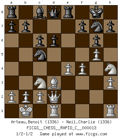 Last move : 1/2-1/2 2006 December 11 12:4:31 [Event "FICGS__CHESS__RAPID_C__000013"] [Site "FICGS"] [Date "2006.11.14"] [Round "1"] [White "Arteau,Benoit"] [Black "Neil,Charlie"] [Result "1/2-1/2"] [WhiteElo "1336"] [BlackElo "1336"] 1.d4 Nf6 2.Nf3 g6 3.Nc3 d6 4.e4 Bg7 5.h3 O-O 6.Be3 c6 7.Bd3 Nbd7 8.Qd2 Re8 9.g4 e5 10.O-O-O exd4 11.Bxd4 Nf8 12.g5 Nh5 13.Bxg7 Nxg7 14.Nh4 Nfe6 15.f4 Nc5 16.Kb1 1/2-1/2 King's Indian : East Indian defense Kingside Castling by player Black (move 5) Queenside Castling by player White (move 10) This chess game ended in a draw. Follow this game move after move (download)I give 98 percent of my mental energy to Chess. Others give only 2 percent. (Bobby Fischer) Fischer machte Schach einfach zu einer aufregenden Sache, wann immer er sich ans Brett setzte. (Raymond Keene) Una de estas pequeñas movidas modestas pudieran ser mas molestas a tu oponente que la amenaza mas grande. (Siegbert Tarrasch) Les Echecs ne sont pas pour les âmes timides. Ils requièrent un homme entier, qui ne s'arrête pas aveuglément à ce qui a été déjà établi, mais qui tente individuellement de sonder les profondeurs du jeu. (W. Steinitz) You can only get smarter by playing a smarter opponent. (Revolver, movie)