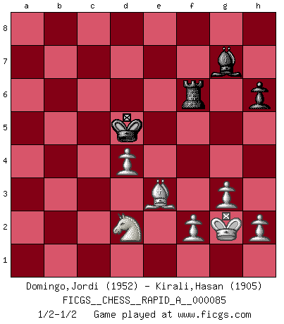 Last move : 1/2-1/2 2010 November 13 15:2:35 [Event "FICGS__CHESS__RAPID_A__000085"] [Site "FICGS"] [Date "2010.07.14"] [Round "1"] [White "Domingo,Jordi"] [Black "Kirali,Hasan"] [Result "1/2-1/2"] [WhiteElo "1952"] [BlackElo "1905"] 1.b4 e5 2.Bb2 Bxb4 3.Bxe5 Nf6 4.c4 O-O 5.e3 d5 6.cxd5 Nxd5 7.Nf3 Re8 8.Bb2 Nc6 9.Be2 Bf5 10.O-O Bf8 11.d4 Qd7 12.Nbd2 h6 13.Nc4 Qe6 14.Nce5 Rad8 15.Qb3 a6 16.Rfc1 Na5 17.Qa4 b5 18.Bxb5 axb5 19.Qxa5 b4 20.Qa4 Nb6 21.Qb3 f6 22.Nc4 Nxc4 23.Rxc4 Bd6 24.R4c1 Be4 25.Qxe6+ Rxe6 26.Nd2 Bd5 27.a4 Ra8 28.a5 Ra6 29.Kf1 Re8 30.g3 Rea8 31.e4 Bf7 32.e5 Bf8 33.Rxc7 Rxa5 34.Rxa5 Rxa5 35.exf6 Ra2 36.Bc1 b3 37.fxg7 Bxg7 38.Rxf7 Kxf7 39.Nxb3 Ke6 40.Be3 Kd5 41.Nd2 Ra6 42.Nf3 Ke4 43.Kg2 Rf6 44.Nd2+ Kd5 1/2-1/2 Polish (Sokolsky) opening Kingside Castling by player Black (move 4) Kingside Castling by player White (move 10) This chess game ended in a draw. Follow this game move after move (download)Chess is so inspiring that I do not believe a good player is capable of having an evil thought during the game. (Wilhelm Steinitz) Ein Teil des Fehlers ist immer korrekt. (Savielly Grigorievitsch Tartakower) Dejen al perfeccionista jugar por correo. (Yasser Seirawan) Fischer est le meilleur joueur du monde et Karpov n'est qu'un joueur de bistrot. (Garry Kasparov, agé de 16 ans) Crush them ! Make them suffer ! (General Grievous in Star Wars ep.3)