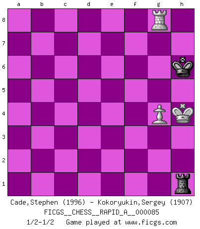 Last move : 1/2-1/2 2010 August 18 12:43:38 [Event "FICGS__CHESS__RAPID_A__000085"] [Site "FICGS"] [Date "2010.07.14"] [Round "1"] [White "Cade,Stephen"] [Black "Kokoryukin,Sergey"] [Result "1/2-1/2"] [WhiteElo "1996"] [BlackElo "1907"] 1.d4 d5 2.c4 e6 3.Nc3 Nf6 4.Nf3 c6 5.Bg5 h6 6.Bh4 dxc4 7.e4 g5 8.Bg3 b5 9.Be2 Bb7 10.h4 g4 11.Ne5 h5 12.O-O Nbd7 13.Qc2 Nxe5 14.Bxe5 Bg7 15.b3 cxb3 16.axb3 O-O 17.Bg3 Qxd4 18.Rad1 Qb6 19.e5 Ne8 20.Ne4 Bh6 21.Rd6 a5 22.Rfd1 a4 23.bxa4 Rxa4 24.Rd7 c5 25.Nxc5 Ra7 26.Bd3 Kh8 27.Nxb7 Rxb7 28.Rxb7 Qxb7 29.Qc5 Kg8 30.Qb4 Qa8 31.Qxb5 Ng7 32.Qd7 Qe8 33.Qc7 Qc8 34.Qd6 Qa8 35.Kh2 Rc8 36.Qb4 Rc1 37.Be4 Qc8 38.Rd4 Ne8 39.Qe7 Rc7 40.Rd8 Rxe7 41.Rxc8 Kg7 42.f3 Nc7 43.fxg4 hxg4 44.h5 Bg5 45.h6+ Kxh6 46.Rh8+ Kg7 47.Rh5 f5 48.Bxf5 exf5 49.Rxg5+ Kh7 50.Rxf5 Nd5 51.Bh4 Re6 52.Bf6 Kg6 53.Rg5+ Kh6 54.Rxg4 Nxf6 55.exf6 Rxf6 56.Kh3 Rf5 57.Rg8 Rf4 58.g4 Rf1 59.Kh4 Rh1+ 1/2-1/2 QGD Semi-Slav Kingside Castling by player White (move 12) Kingside Castling by player Black (move 16) 10 pieces endgame at move 49 : White KRBPP , Black KRNPP WHITE : King + 1 Rook 1 Bishop 2 Pawns BLACK : King + 1 Rook 1 Knight 2 Pawns 9 pieces endgame at move 50 : White KRBPP , Black KRNP WHITE : King + 1 Rook 1 Bishop 2 Pawns BLACK : King + 1 Rook 1 Knight 1 Pawn 8 pieces endgame at move 54 : White KRBPP , Black KRN WHITE : King + 1 Rook 1 Bishop 2 Pawns BLACK : King + 1 Rook 1 Knight 7 pieces endgame at move 54 : White KRPP , Black KRN WHITE : King + 1 Rook 2 Pawns BLACK : King + 1 Rook 1 Knight 6 pieces endgame at move 55 : White KRPP , Black KR WHITE : King + 1 Rook 2 Pawns BLACK : King + 1 Rook 5 pieces endgame at move 55 : White KRP , Black KR WHITE : King + 1 Rook 1 Pawn BLACK : King + 1 Rook This chess game ended in a draw. Follow this game move after move (download)Chess is imagination. (David Bronstein) Das Spiel gibt uns die Genugtuung, die das Leben uns versagt. (Emanuel Lasker) Te sientas frente a un tablero y repentinamente tu corazón brinca. Tu mano tiembla al tomar una pieza y moverla. Pero lo que el Ajedrez te enseña es que tu debes permanecer ahí con calma y pensar de que si realmente es una buena idea o de que si hay otras ideas mejores. (Stanley Kubrick) Roi des jeux et jeu des rois, les échecs portent en eux un sentiment d'infini. Ils donnent à celui qui s'est efforcé d'en approfondir les arcanes l'impression de n'être pas à la mesure de l'homme; en fait, ils constituent un résumé de l'univers, un microcosme, et figurent cette grande échelle qui, dans les plans de la lumière descend jusqu'à la matière, qui des abîmes insondables remonte jusqu'en l'infini de Dieu. (Pyrame) The beginning of wisdom is silence. The second step is listening. (Unknown)